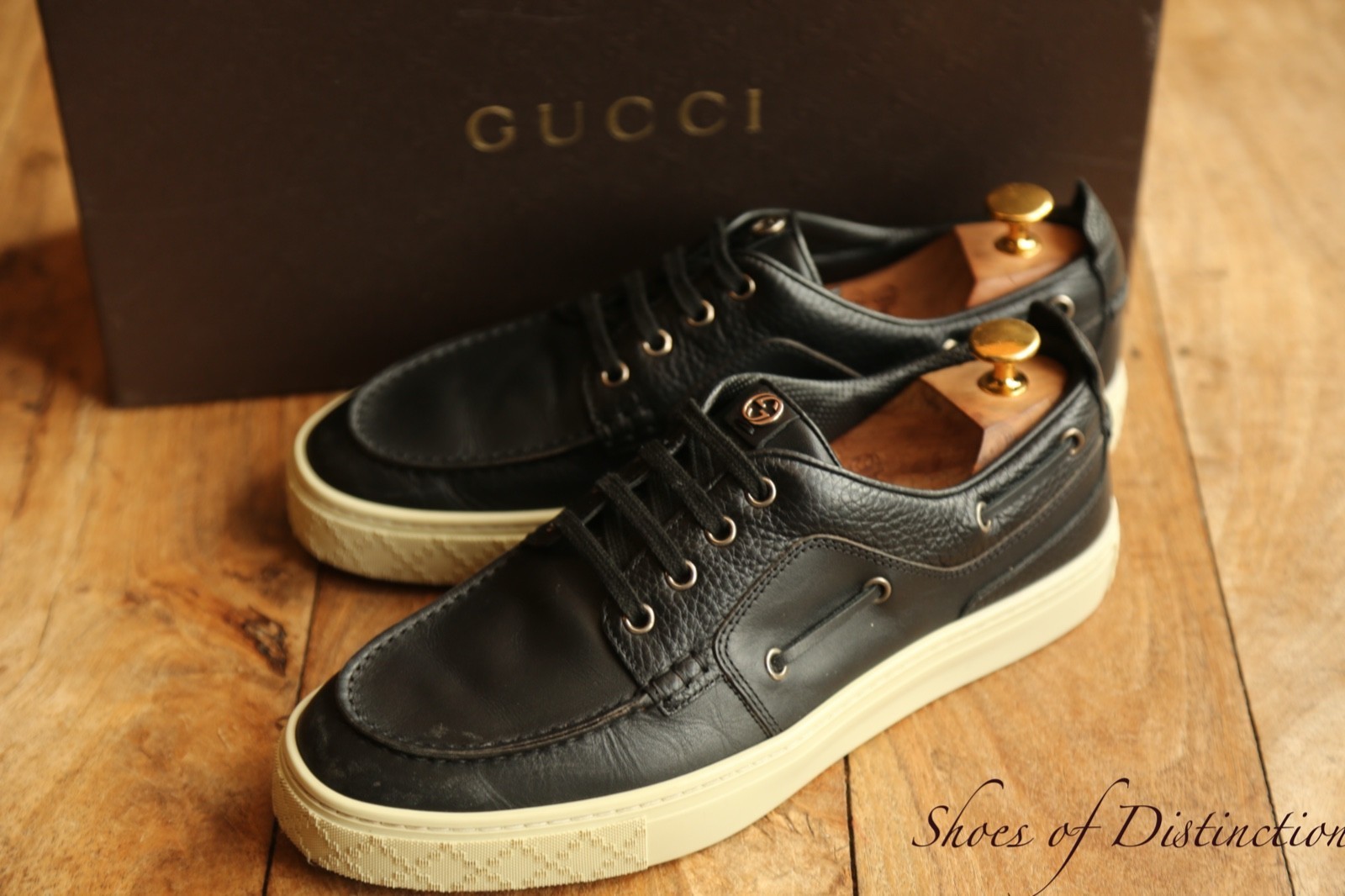 Gucci Black Leather Boat Deck Trainers Shoes. UK 7 US 8 EU 41. At first all our footwear is thoroughly inspected and any imperfections noted. Shoes of Distinction. Outer sole heel to toe (approx) 29 cm.