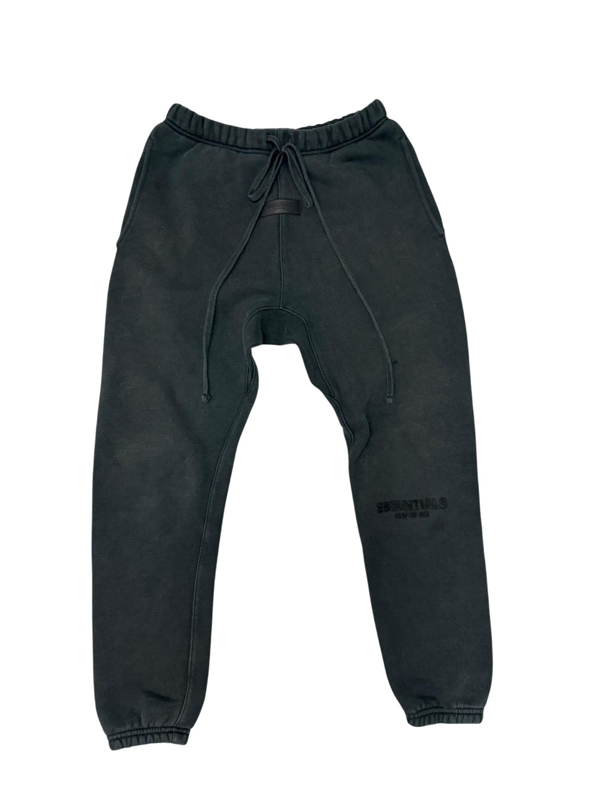 Fleece fabric shows moderate overall wash fading and softening from wear, most visible on the thighs and seat. Small dark spot is present on the right front thigh as shown. Light lint and minor surface wear throughout but no holes or tears; waistband, drawcord, pockets, and cuffs are intact and functional.
