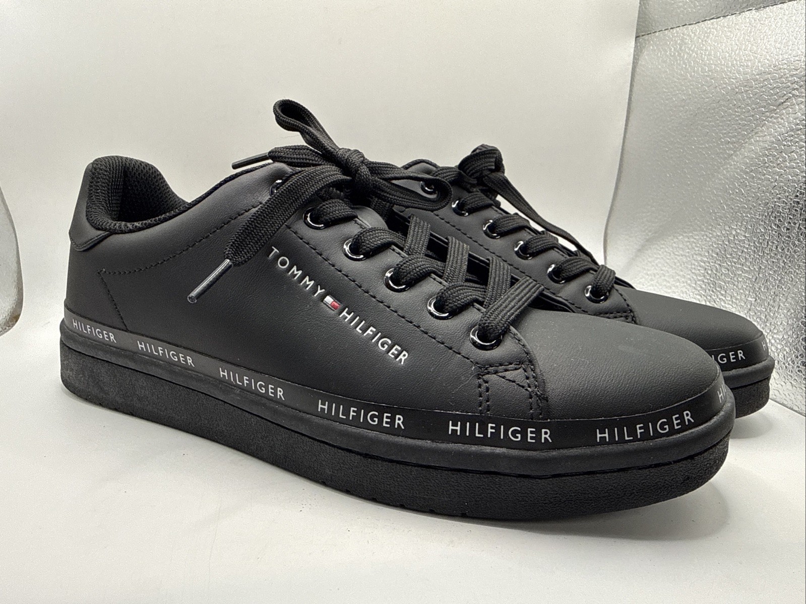 The TOMMY HILFIGER Men's Levels sneakers in size 7.5 are a stylish and versatile choice for casual occasions. Featuring a low top shaft style, lace-up closure, and solid black color, these sneakers are perfect for any season. Made with faux leather upper material and a rubber outsole, these athletic shoes offer comfort and durability for walking activities. The iconic Tommy Hilfiger branding adds a touch of classic style to these sneakers, making them a great addition to any man's shoe collection.