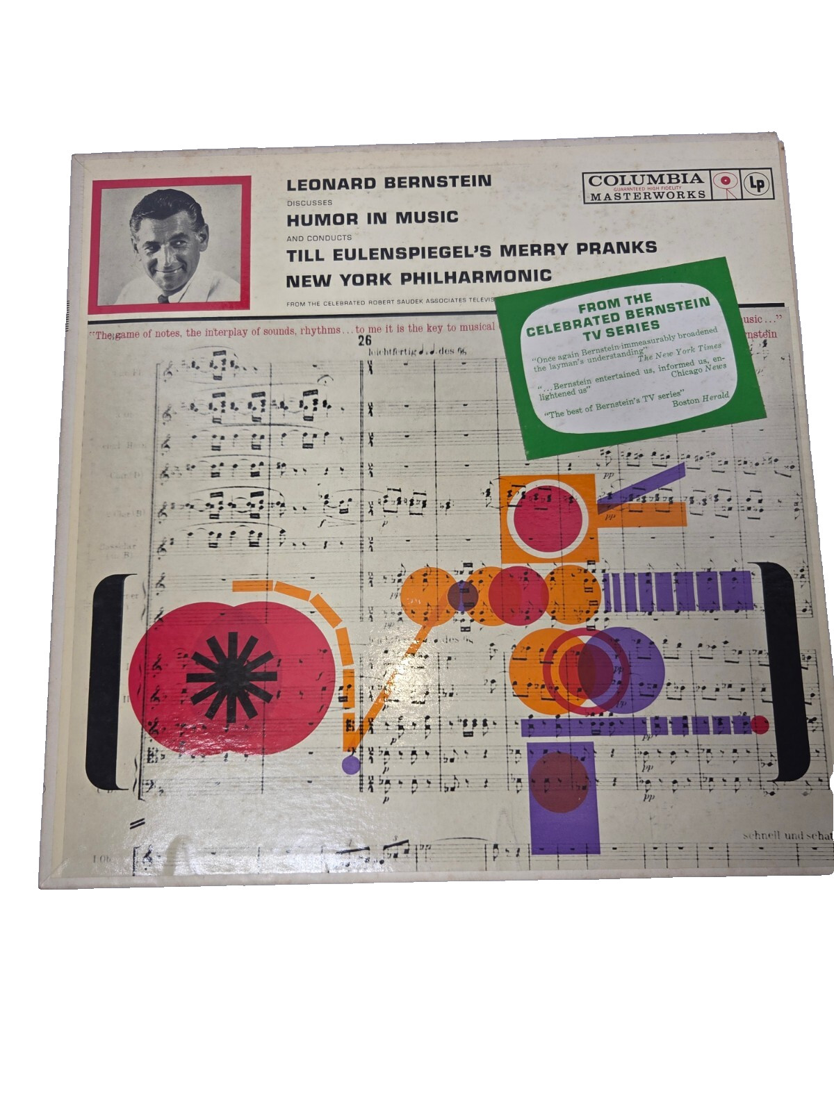 The product is a vinyl LP record titled "Leonard Bernstein Humor In Music Til Eulenspiegel's Merry Pranks" released by Columbia Masterworks in 1960. Conducted by Leonard Bernstein, the New York Philharmonic Orchestra performs music by Richard Strauss in this educational classical genre album. The record is in very good condition (VG) with a good (G) cardboard sleeve and original cover. This 12" LP features mono audio channels and plays at 33 RPM, making it a valuable addition to any vinyl records collection for classical music enthusiasts.