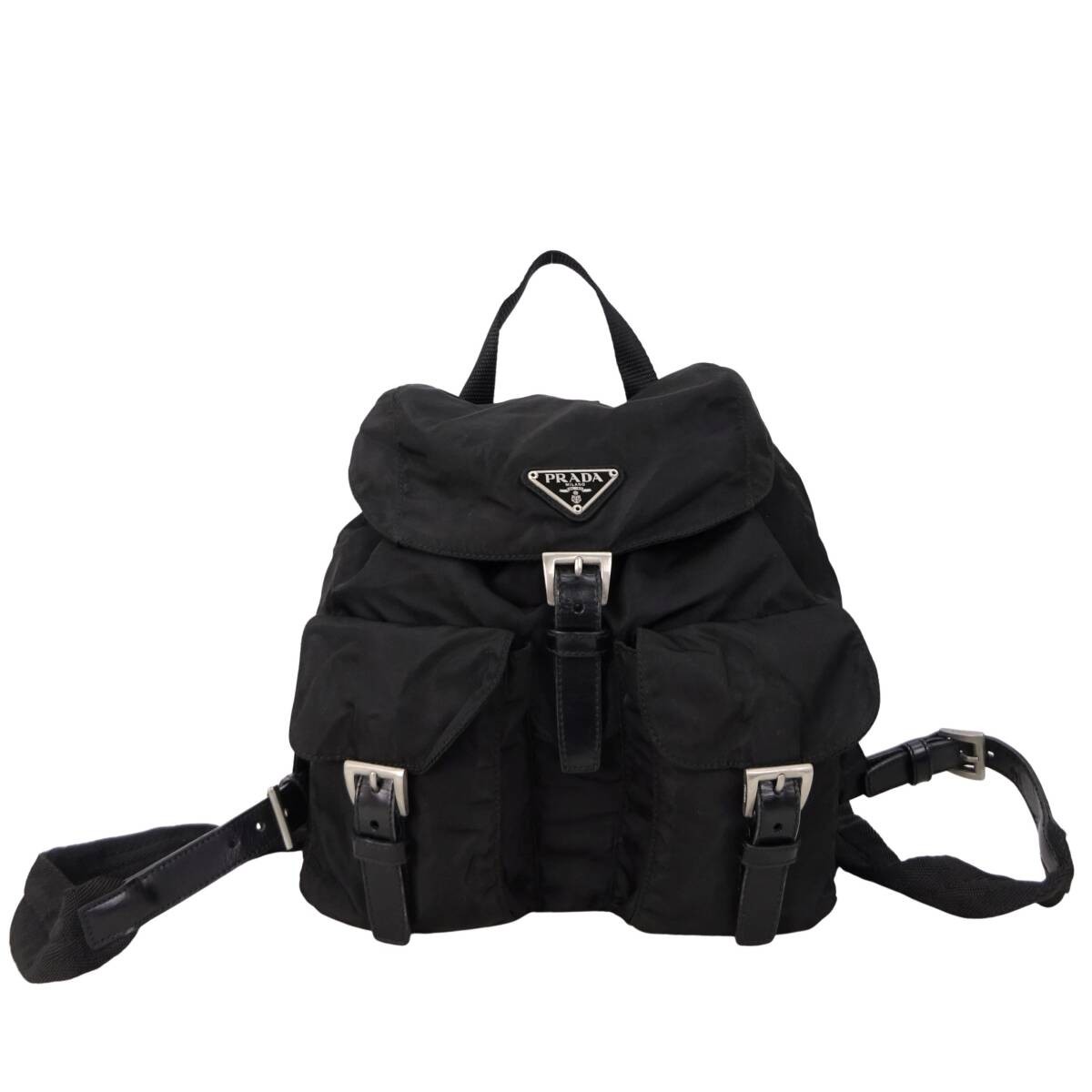 PRADA Small Backpack Triangle Logo Black Nylon Leather Silver Backpack Daypack | ThriftGalaxy — ThriftGalaxy