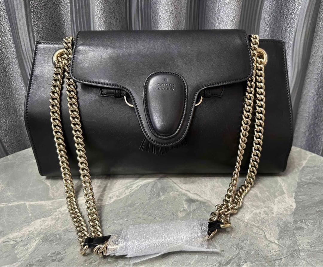 This is an authentic GUCCI chain tote bag, crafted from high-quality leather with silver-tone hardware. The bag is in good condition with no noticeable stains or scratches, though minor signs of use may be present.
