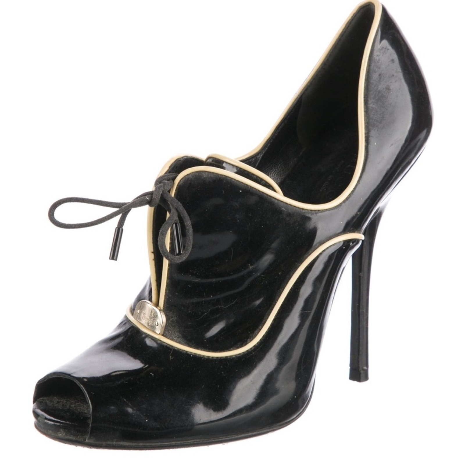 These Gucci heels feature a sleek black patent leather finish with a sophisticated lace-up design and a high stiletto heel. The oxford-inspired style adds a unique twist, making them perfect for formal occasions.