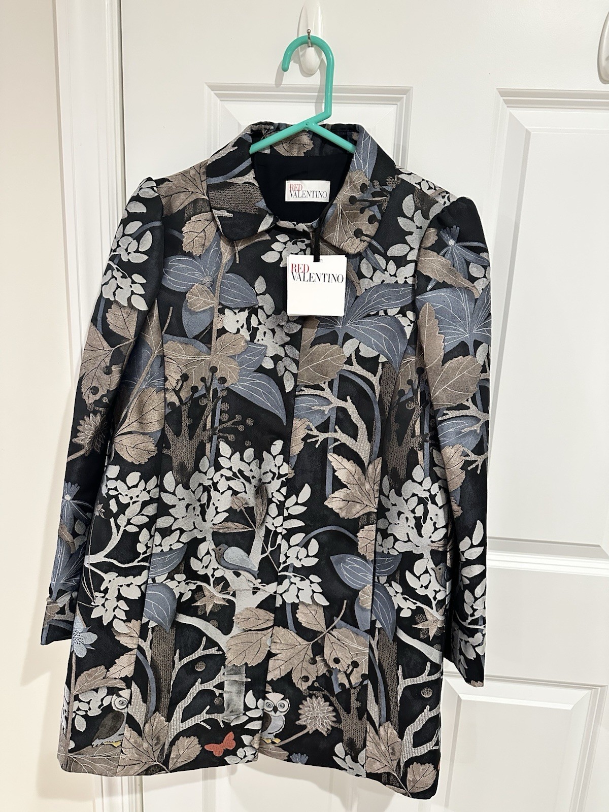 Red Valentino womens black jacket with a metallic floral and bird jacquard pattern, featuring a structured silhouette with hidden front buttons, Peter Pan collar, and a gathered back peplum detail. Lined in black fabric, the piece is constructed in polyester with an acetate-blend lining. Labeled size 44 (US 6), retains original retail tag. Measures approximately 18.5 inches across the bust, 32.5 inches in length, and 23-inch sleeve length.