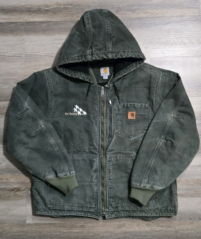 Classic Carhartt J130 in the sought-after Moss Green (MOS) colorway. Manufactured in July 2014. This is the original, heavy-duty version with the soft Sandstone Duck finish. Length: 26". Sleeve: 26".