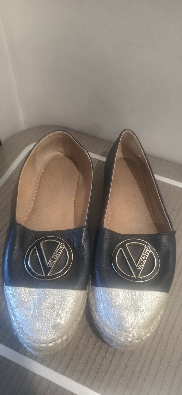 The product is a pair of Mario Valentino Pineto Black Gold Slides Flats in size 37, which is a US shoe size 7 and EU shoe size 37. These solid black flats are designed for casual occasions and made with leather lining material. With a stylish flat design and leather upper material, they are perfect for the summer, fall, and spring seasons. The Valentino brand ensures a touch of luxury to these versatile and fashionable shoes, making them a must-have for any woman's wardrobe.