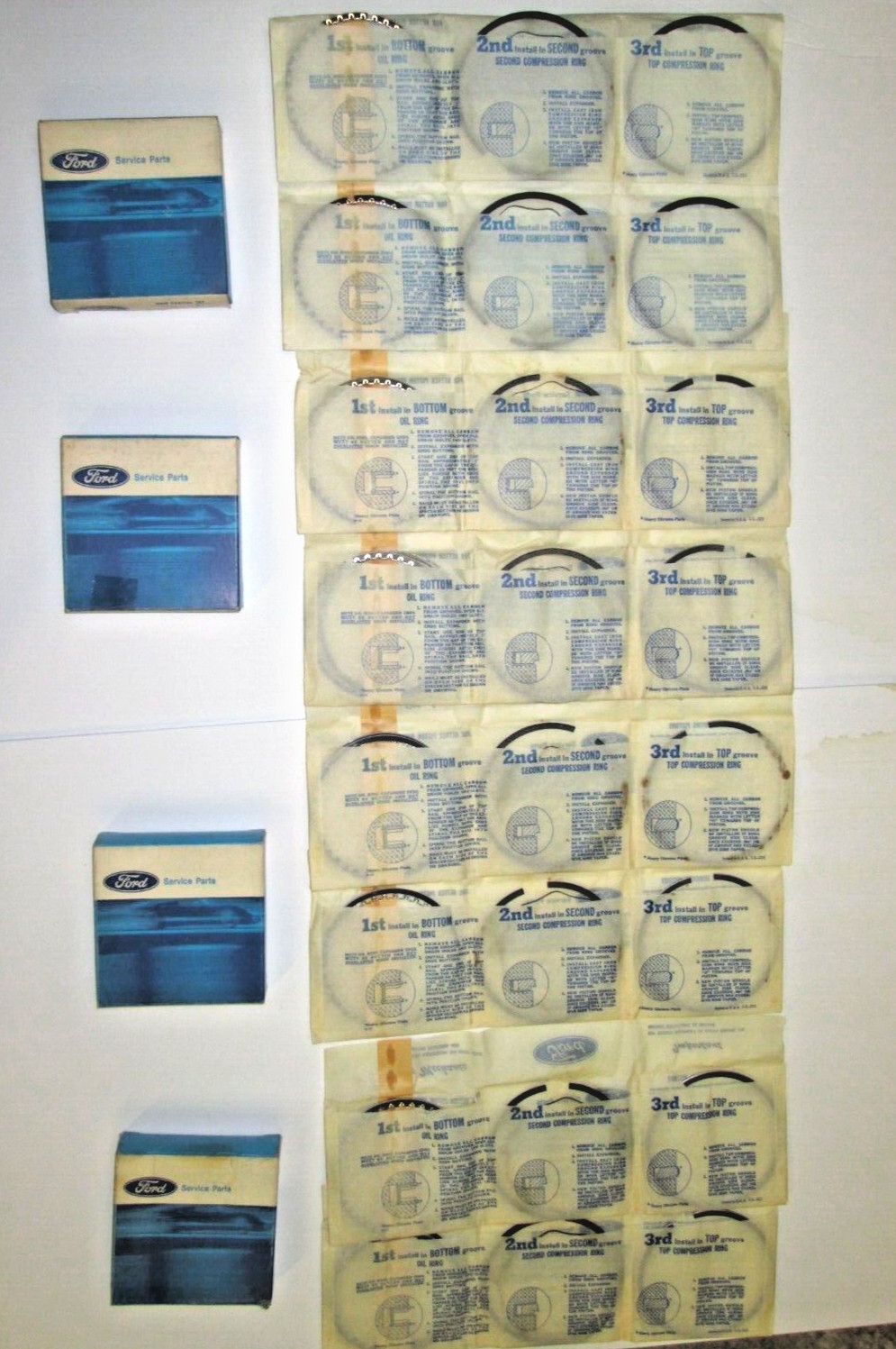 68-70 Fairlane GT. 61-62 Full Size Ford Special 390 4/B, 6/B, 8/B. 62-63 T-Bird Special 390 6/B. 68-70 Cougar 2/B, 4/B. These 8 original Ford piston ring sets are in very good - NOS - condition. They have never been removed from their original sleeves.