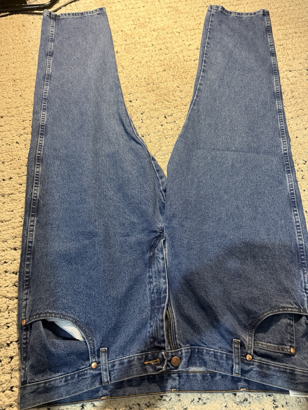 The Wrangler Premium Performance Cowboy Cut Stretch Straight Jeans in size 42x34 are a high-quality denim staple for men. Made from a blend of polyester, spandex, and cotton, these jeans offer a comfortable and stretchy fit for all-day wear. The solid blue color and classic 5-pocket design with a zip and button closure make them versatile for any season, while the branding accents add a touch of Western flair. Machine washable and featuring a regular fit, these jeans by Wrangler are a reliable choice for any cowboy-inspired wardrobe.