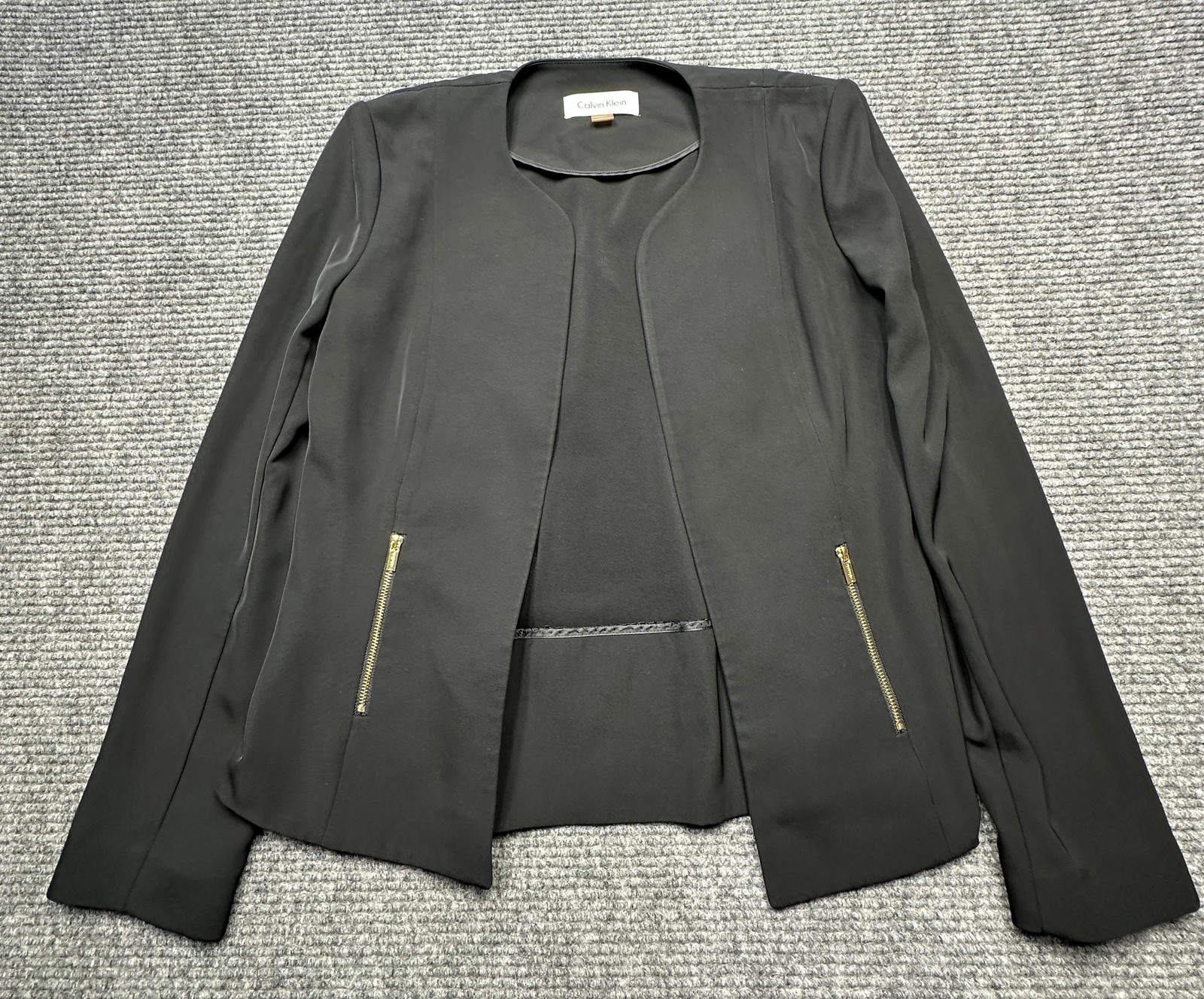 Details: Collarless neckline, open front with no closure, two front zip pockets with exposed gold-tone zippers, three gold-tone decorative buttons at each sleeve cuff, shaping seams at front and back for a slim, tailored fit, slightly flared hem for a polished silhouette.