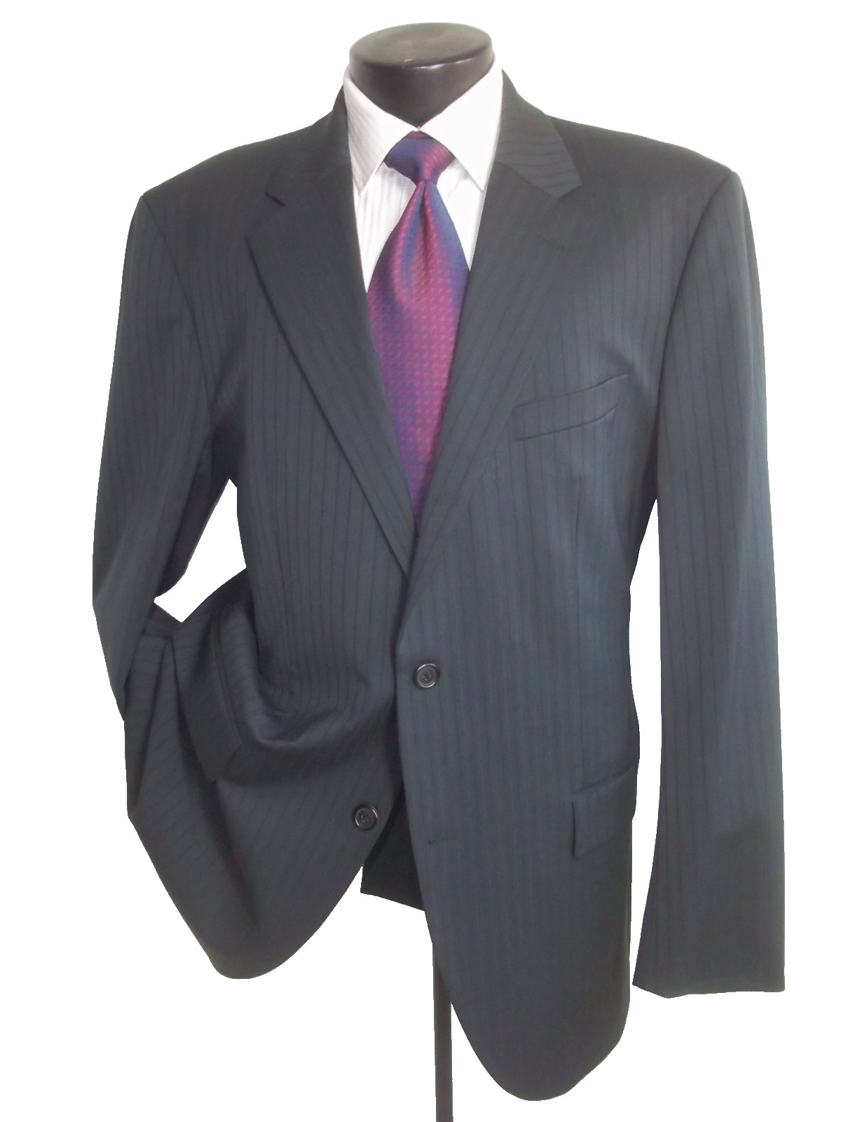 Hugo Boss, pale black, shadow striped, 2 buttons, center vent, wool suit 44 Long. Trousers are flat front, plain bottoms. We have more designer suits, jackets, blazers, silk ties, dress pants, shirts and more.
