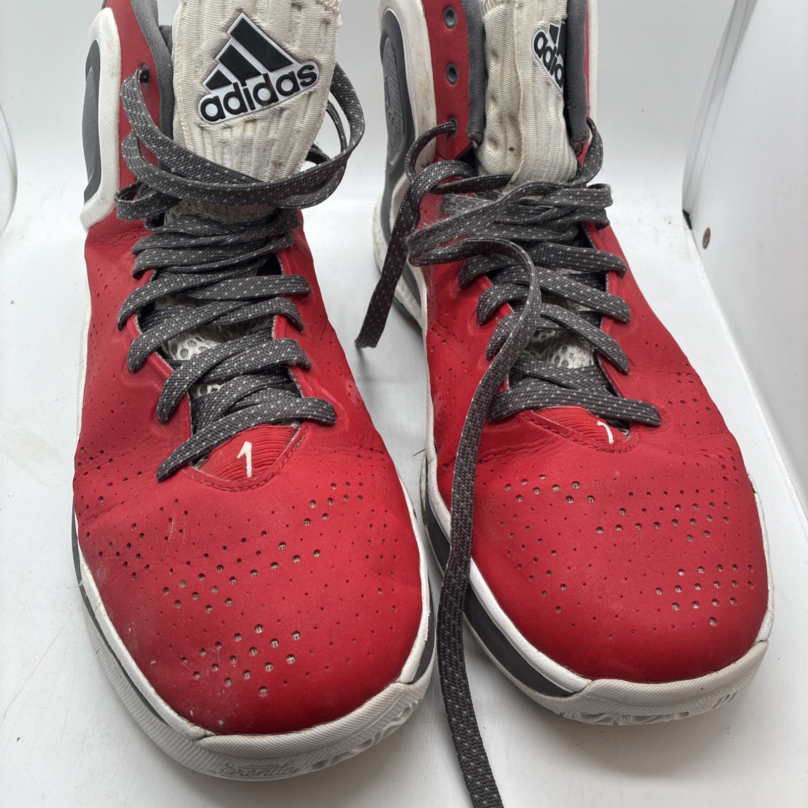 The product is a pair of size 12 Adidas Rose 5 basketball shoes for men. These mid-top sneakers feature a bold red color with a rose theme, inspired by the model name (Derrick Rose). Designed specifically for basketball performance, these athletic shoes are part of the Adidas Derrick Rose product line and are sure to provide both style and functionality on the court. With their iconic design and comfortable fit, these shoes are perfect for any basketball enthusiast looking to make a statement on the court.