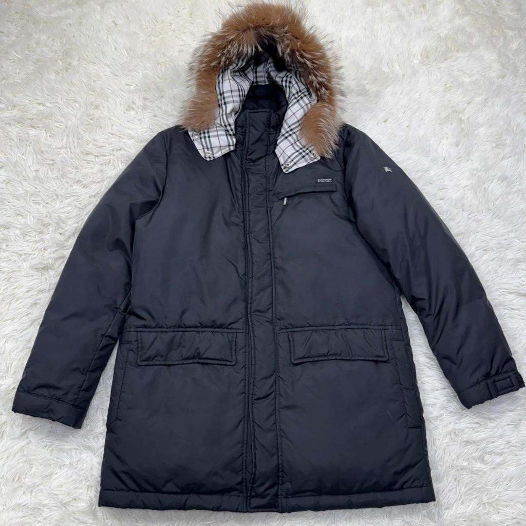 Burberry Black Label 2-way Down Coat, Model SV0106, made with premium white goose down. Features a removable hood with Nova check pattern and silver fox fur trim. Stylish black color with horse logo.