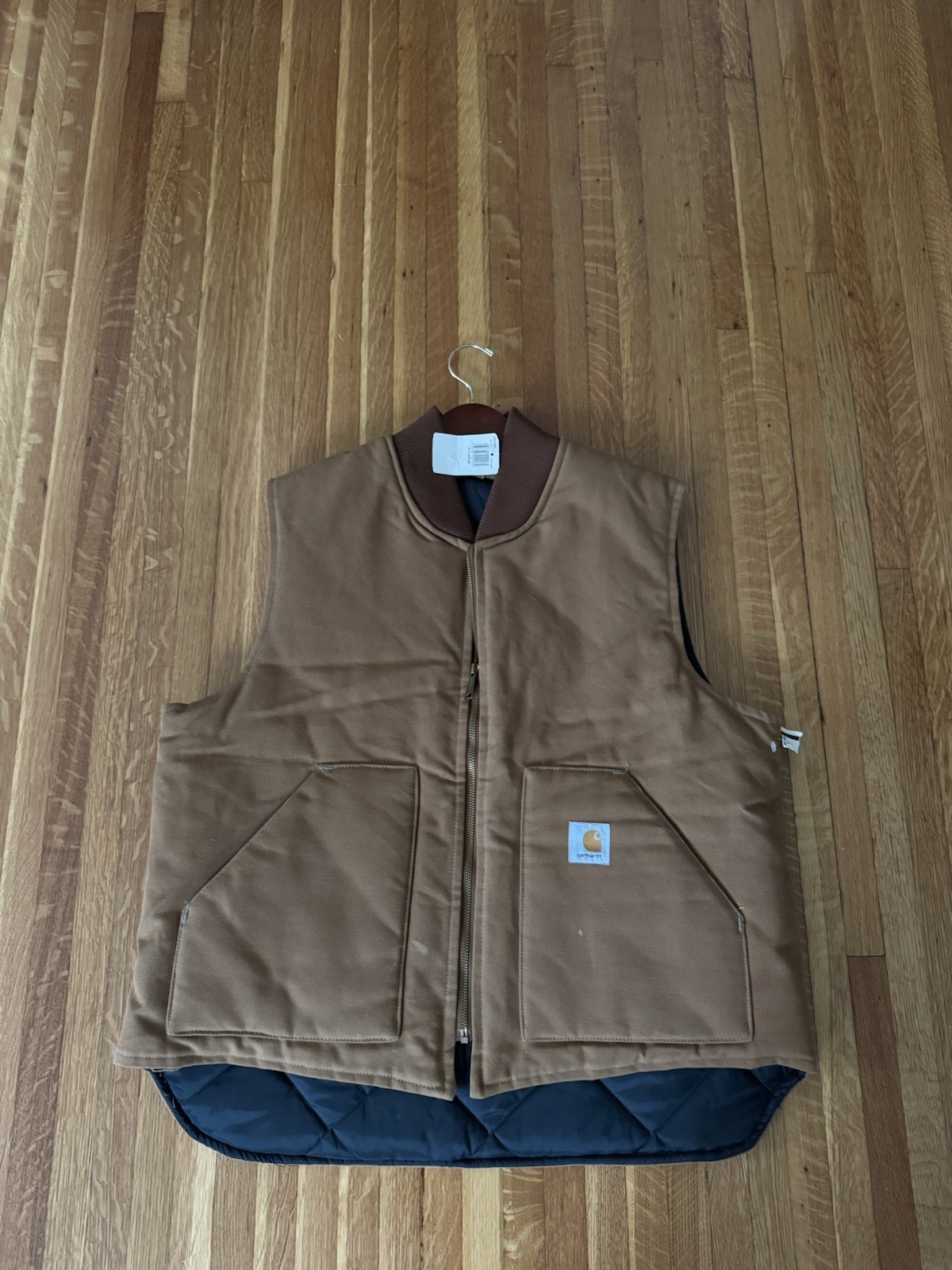 The Carhartt Duck Men's Quilted Vest in size XL is a stylish and practical addition to any man's wardrobe. Made of durable cotton canvas with a warm polyester insulation, this vest is perfect for casual or workwear occasions in the winter, fall, or spring seasons. The stand-up collar and quilted design add a touch of style, while the solid brown color and logo accents give it a rugged outdoor theme. Easy to care for with machine washable instructions, this vest from the Carhartt J97 product line is a must-have for those who value quality and functionality in their clothing choices.