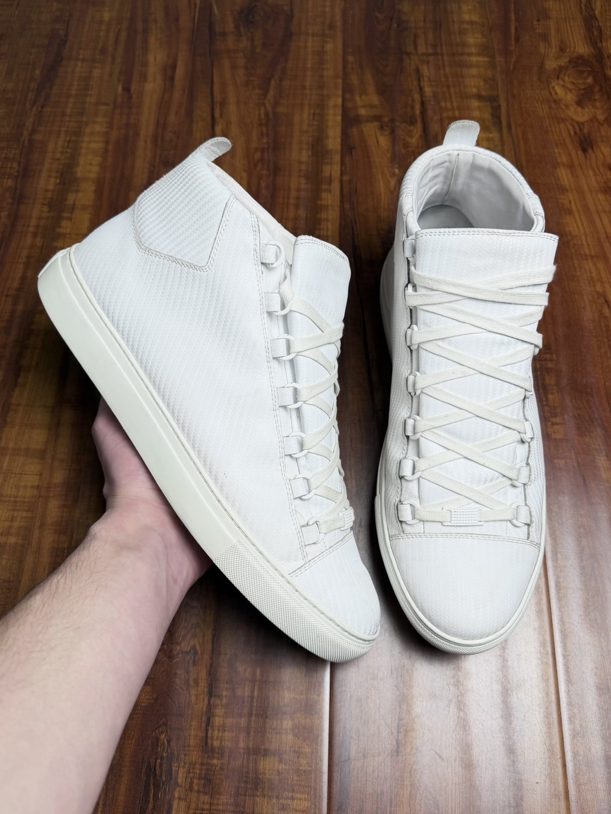 Balenciaga Arena Mens White Leather High Sneakers - Size 44B 11US - SHIP ASAP | ThriftGalaxy — ThriftGalaxy