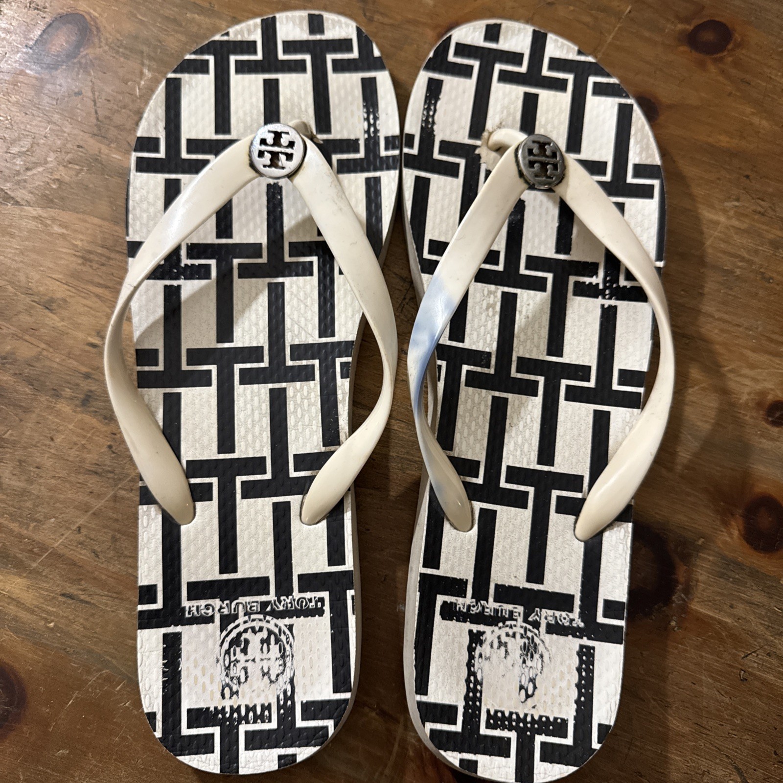 TORY BURCH THONGS FLIP FLOPS SANDALS Sz 10. Good used condition! Right shoe has a blue mark on strap. See pic! Will ship the day after you pay! Thank you!
