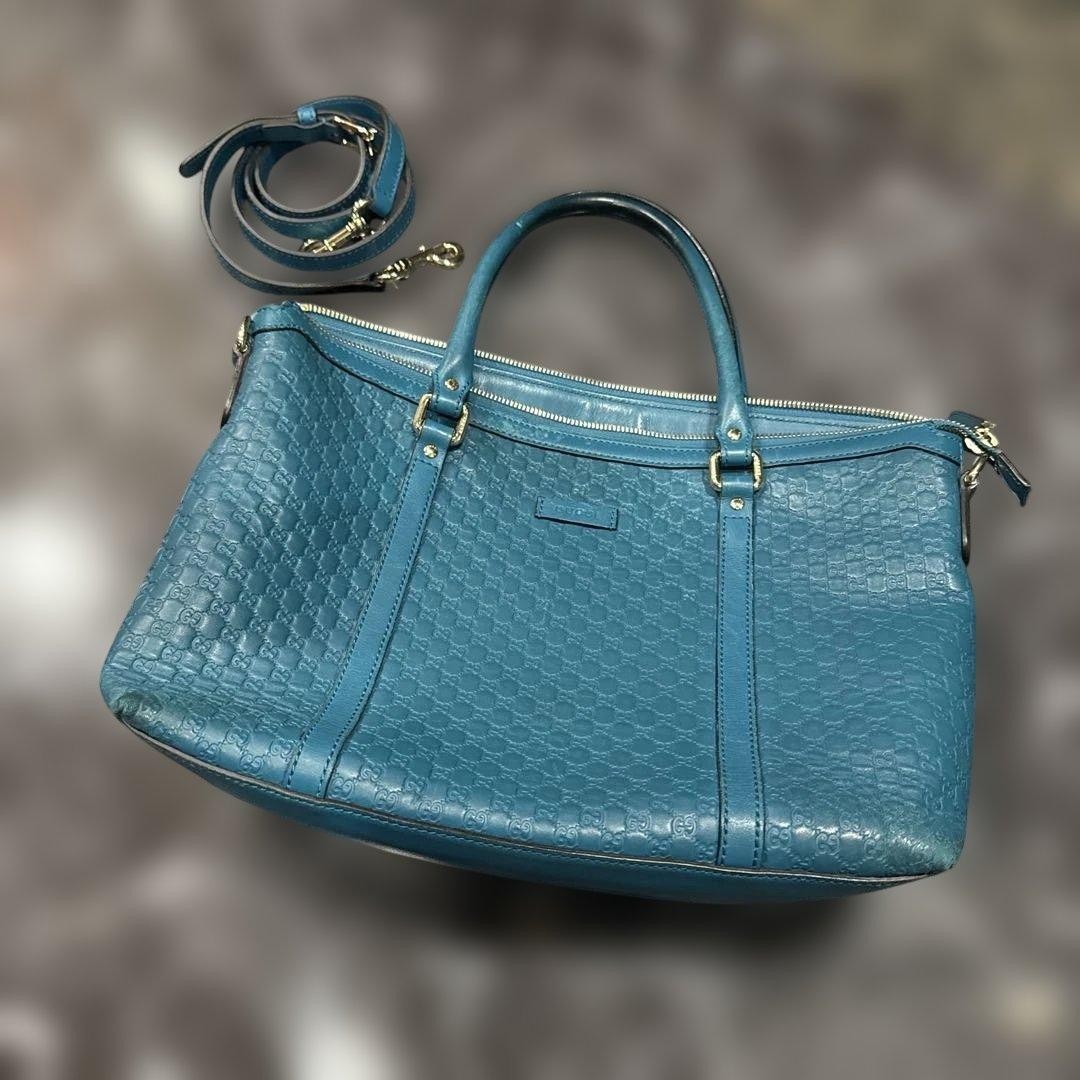 This is an authentic Gucci 2-Way Leather Handbag in a vibrant blue color, featuring the iconic GG pattern. - Pattern: GG pattern. - Authentic Gucci product with original GG pattern. - Design: Shoulder Bag, Handbag.