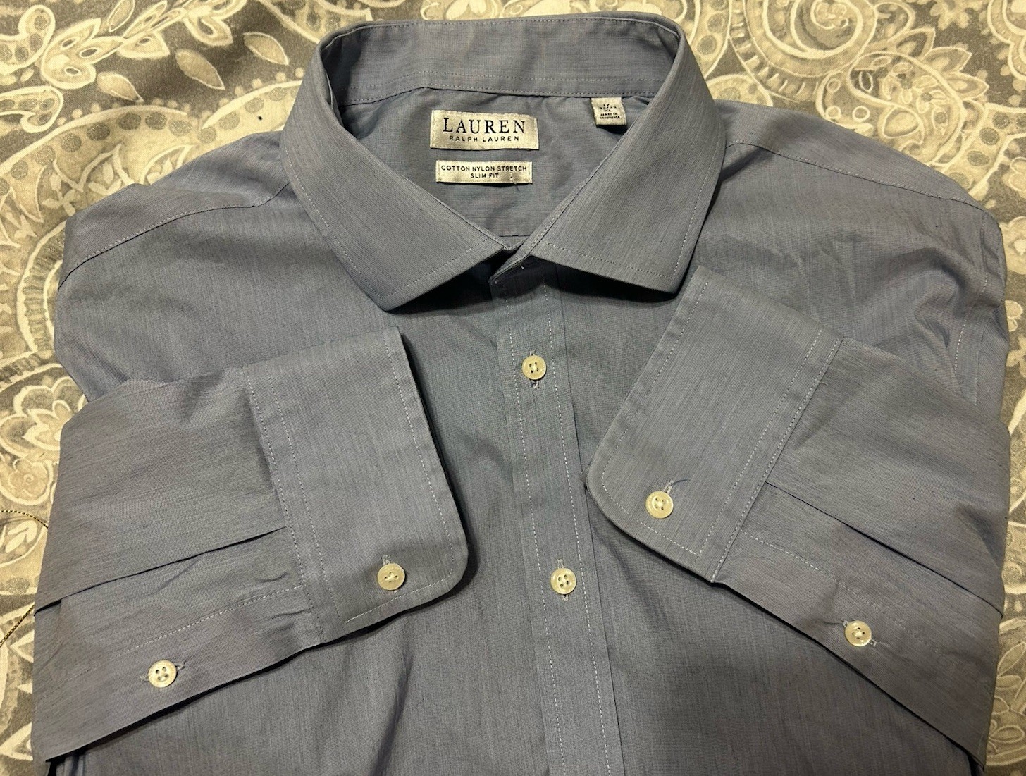 The Lauren Ralph Lauren Slim Fit Stretch Cotton Nylon Dress Shirt in Blue XL (17) is a stylish and versatile men's clothing item. Made from a blend of nylon and cotton, this shirt offers a comfortable and durable option for formal occasions. The slim fit design and spread collar add a modern and sleek touch, while the button closure and barrel cuff detail give it a classic and polished look. Ideal for regular sizing, this dress shirt is perfect for the fashion-conscious man looking for a quality piece with a touch of stretch for added comfort. Great condition!
