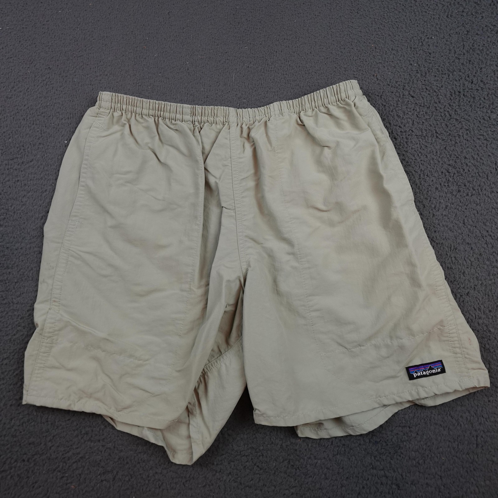 Pre-owned swim shorts with overall wash wear, wrinkling, and light discoloration from regular use. Several small faint spots are visible on the back and lower legs as shown.