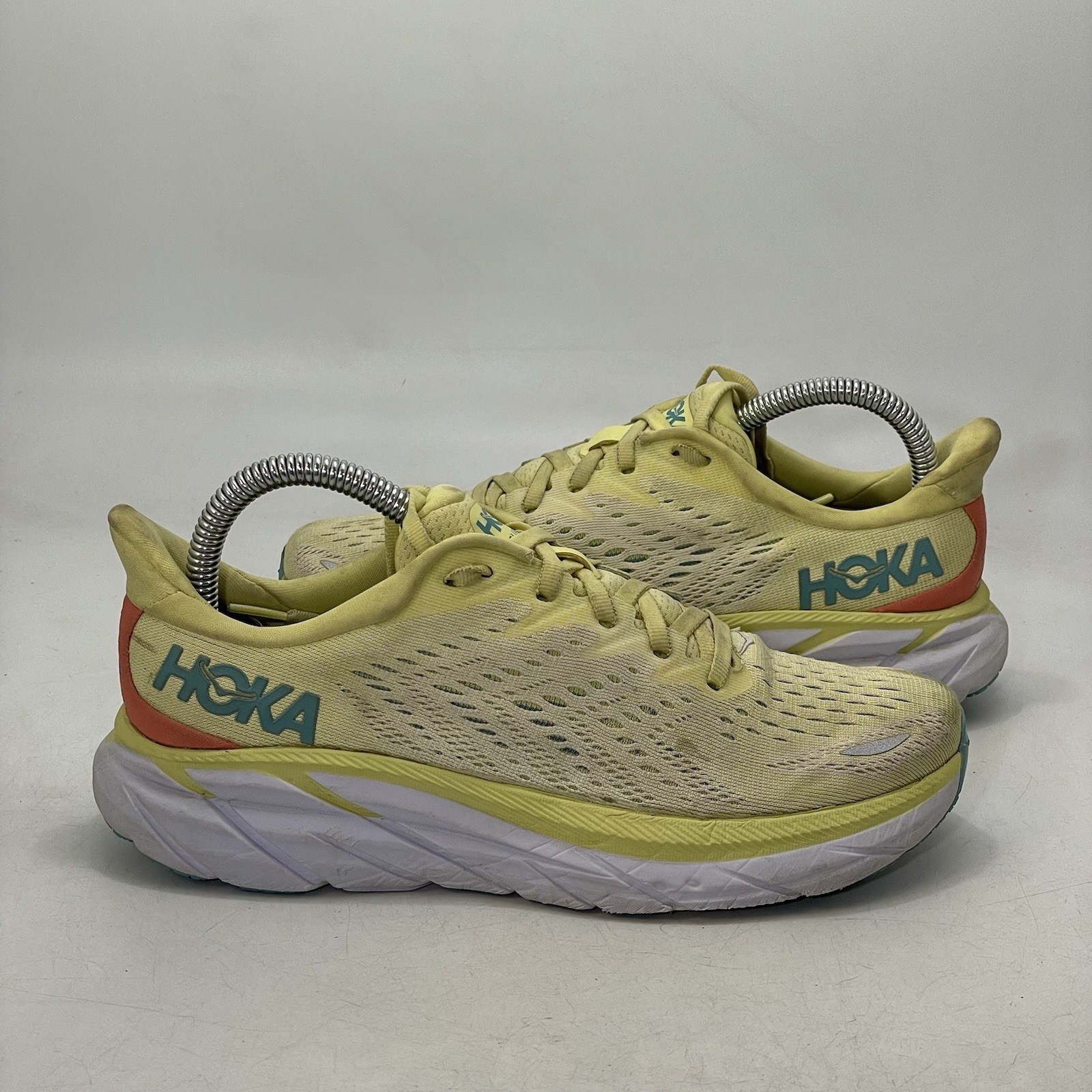 The HOKA One Clifton 8 Yellow walking comfort athletic shoes are designed for women in size 6.5B. These sneakers feature a lace-up closure, rubber outsole, and mesh fabric lining for breathability. The yellow color with logo accents gives a sporty and vibrant look, perfect for casual or activewear occasions during the summer, fall, or spring seasons. With a focus on comfort, these shoes have a foam insole and B width for a comfortable fit, making them ideal for walking, running, or jogging activities. The Hoka One One Clifton 8 model is part of the Clifton product line, known for its performance and athletic design.