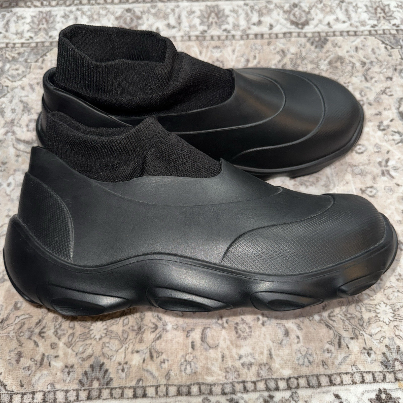 The ZARA Men's Rubber Boots in size 45/US 11 are a stylish and practical choice for casual occasions in the winter, fall, and spring seasons. These Chelsea-style boots feature a round toe, pull-on closure, ankle shaft style, and black color. Made of durable rubber outsole and lined with polyurethane, these boots offer comfort and traction. Designed with a nod to Rick Owen’s style, these boots are a versatile addition to any man's wardrobe. Whether you're running errands or heading out for a casual outing, these ZARA boots are sure to keep you stylish and comfortable.