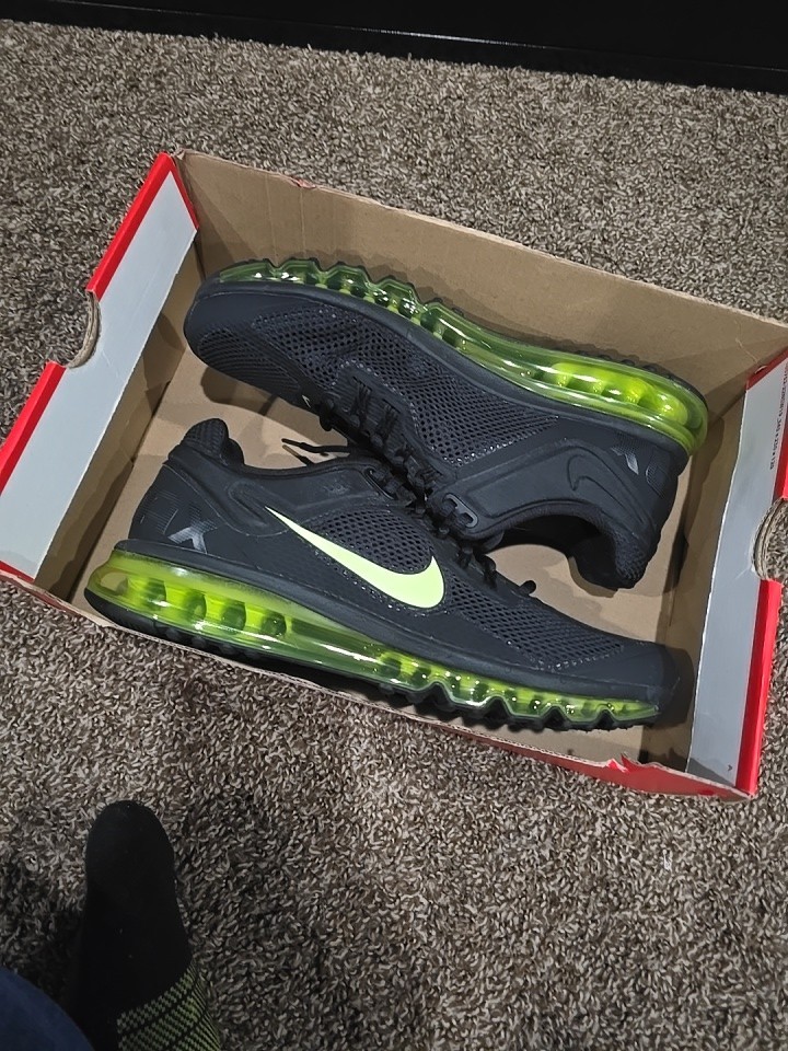 Brand new air max 2013 men's size 10. Im original box, missing lid to box. Black/cyber-anthracite. 100% authentic. I have a collection of shoes that i'm clearing out. Check out my other listing for more.