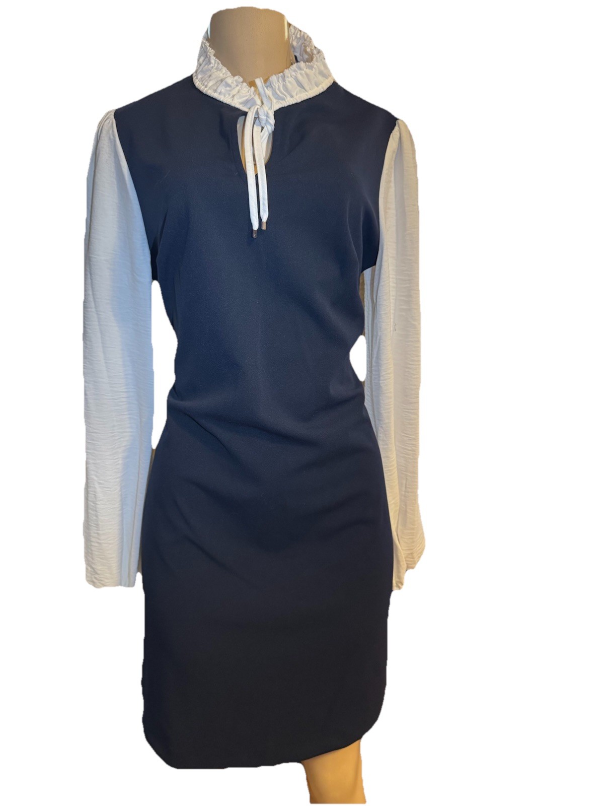 Tommy Hilfiger Navy White Long Sleeve Sheath Dress Ruffle Collar Tie Neck | ThriftGalaxy — ThriftGalaxy