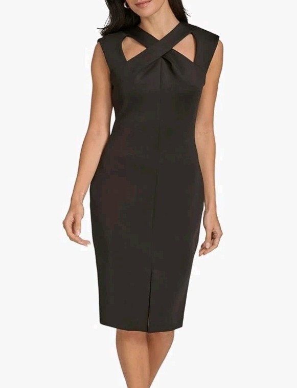 Made from 92% polyester and 8% spandex, this knee-length dress features a flattering sheath style with a sleek black color. The cutout detail at the neckline adds a modern and trendy touch, while the zip closure ensures a secure fit.