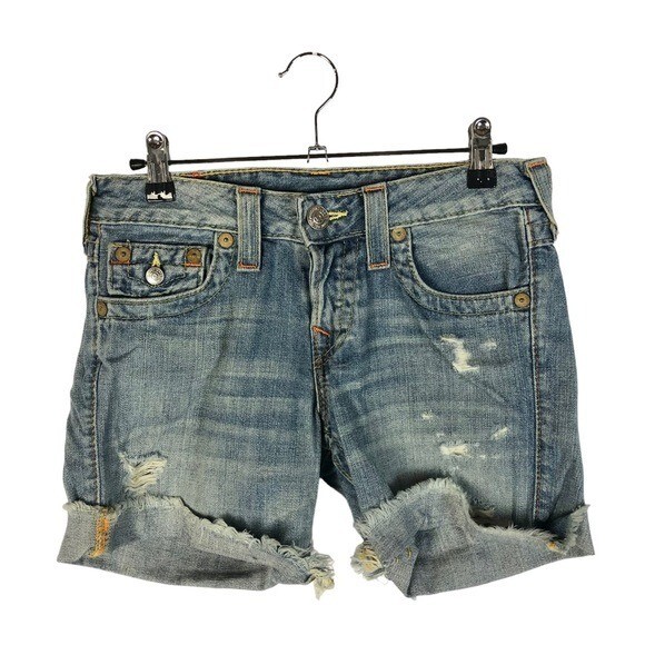 True Religion Jayde Light Wash Cut Off Denim Shorts Good used condition, minimal signs of wear. - Cut off hem - Fold over back pockets - Light blue wash - Low rise waist - Y2K style - 100% cotton Measurements available upon request. All items ship from a smoke & pet free environment. All orders ship same or next business day.