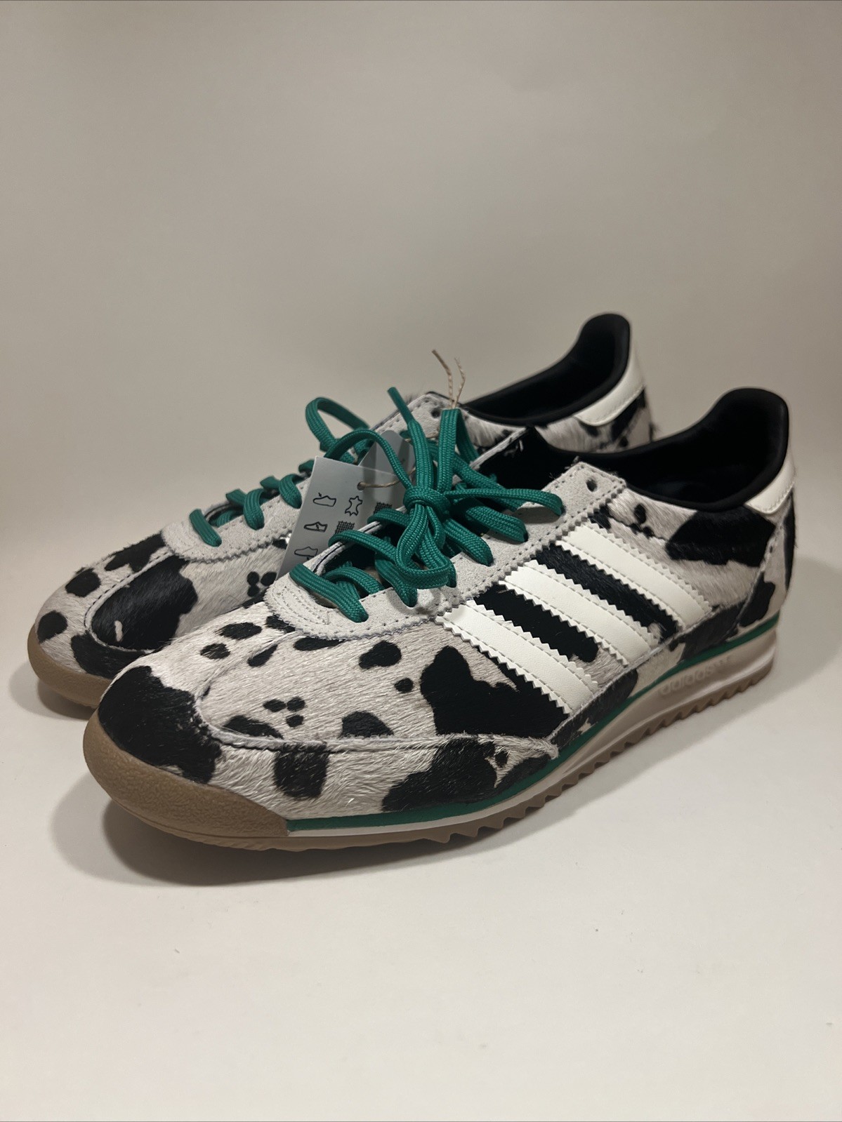 The Adidas SL 72 OG Cow sneakers are a stylish and unique pair of athletic shoes designed for women. Featuring a classic ivory color scheme with a standout cow print nickname, these sneakers are made with high-quality fur upper material and boast the iconic Adidas brand. The release date of February 19, 2025, and the model number JR1255 make these sneakers a desirable addition to any sneaker collection for those looking to make a statement.