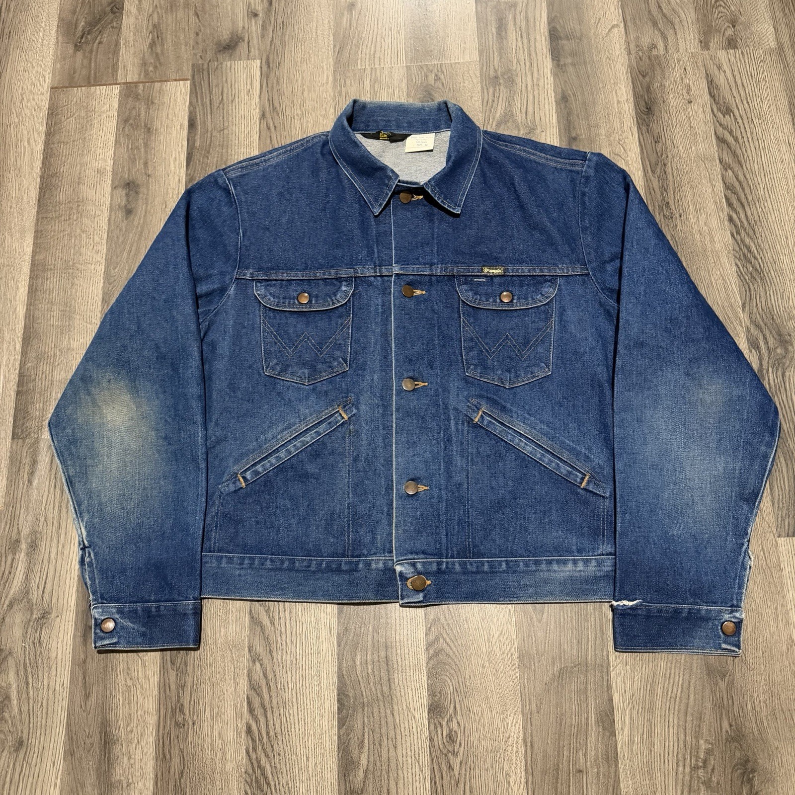 Vintage Wrangler No Fault Denim Jacket 74126NV Made in USA Size 46 Trucker 1970s Original vintage Wrangler No Fault Denim jacket from the 1970s, made in the USA with classic trucker styling and heavyweight denim. The jacket features a beautiful blue faded, naturally washed look that has developed over time, giving it real vintage character. Condition is very clean for its age with only light, normal wear from use. No holes and no major flaws. The denim remains strong and well-structured, fully ready to wear. Tagged size 46 with a boxy, relaxed vintage fit. Please check photos carefully for condition. A timeless Wrangler piece with perfect vintage wash and fade great for everyday wear or collectors.