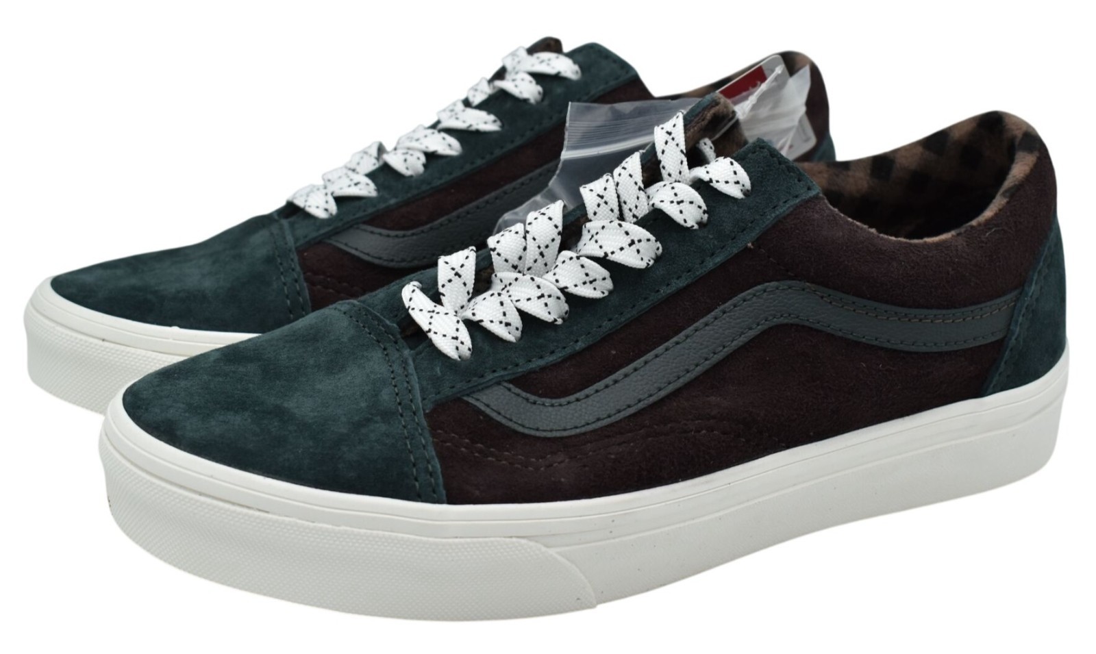 Crafted with a suede upper, these Vans Old Skool sneakers feature a stylish forest green and brown color combination with a plaid interior lining. Durable and comfortable with signature waffle outsoles.
