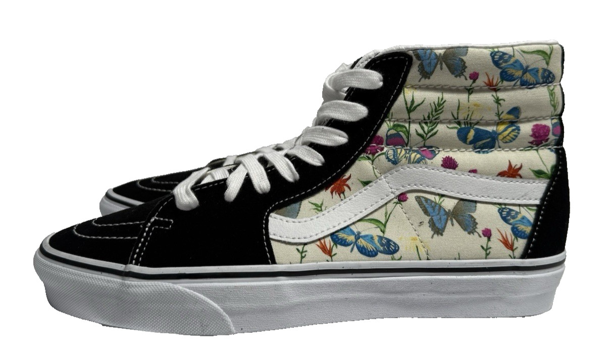 New without box. Soles are clean with no signs of wear. Add a pop of color to your sneaker rotation with these Vans Sk8-Hi butterfly floral high top shoes. Classic black suede and white side stripe are paired with a bright butterfly and wildflower print for a fun, eye–catching look.
