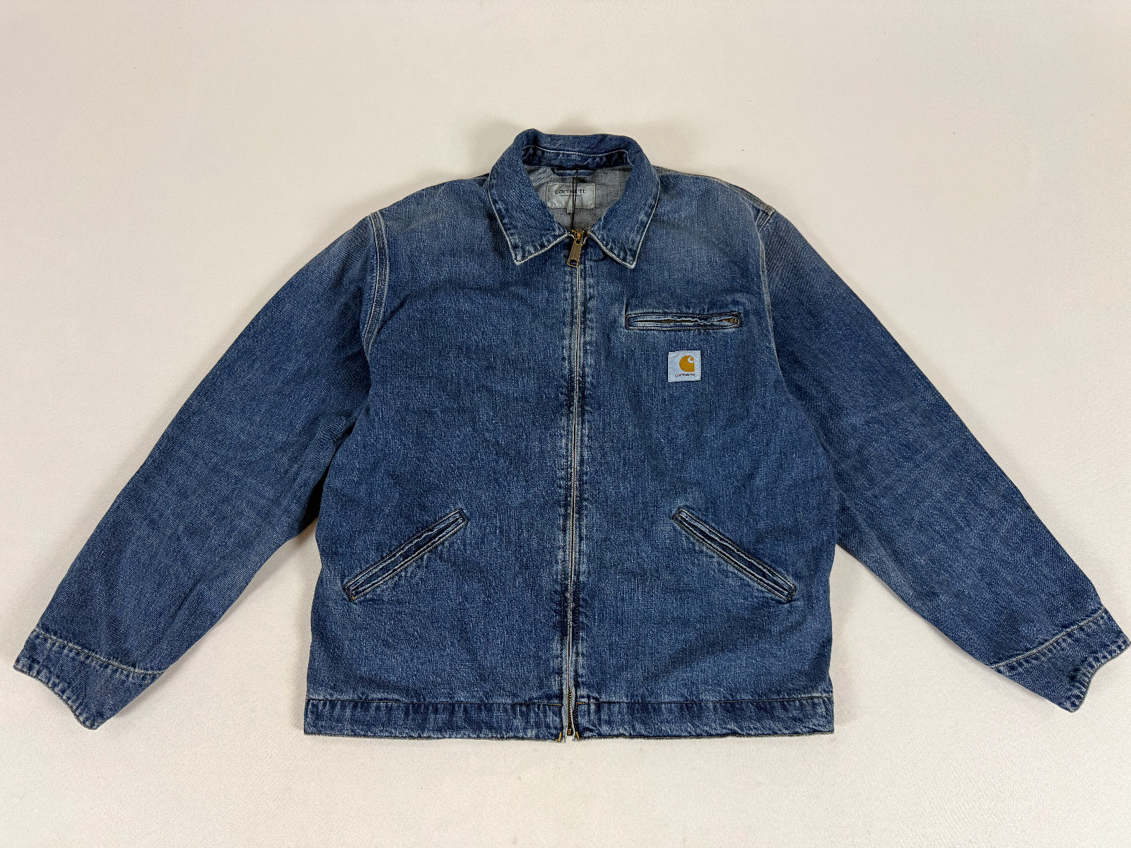 • Carhartt woven square label at left chest. • Carhartt script logos embossed on buttons. • 2 slit pockets at lower front. • 100% cotton Camano denim, 12 oz. • relaxed fit. turn-down collar. • left chest pocket with zip closure.