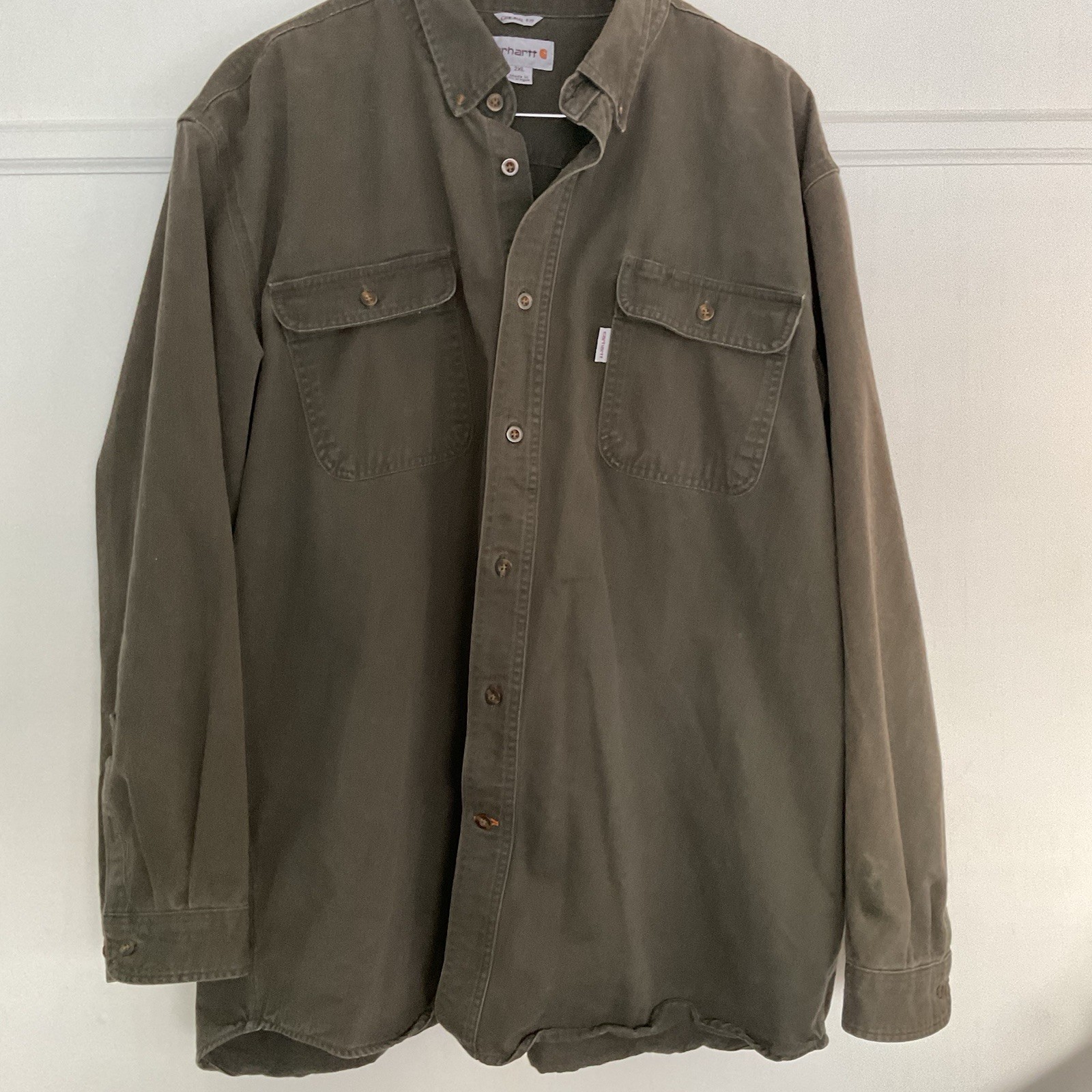 The Carhartt Men's Long Sleeve Original Fit Dark Green Button Down Shirt in size 2XL is a versatile and durable piece of clothing perfect for casual and workwear occasions. Made with soft cotton material and featuring a solid pattern, collared neckline, and button closure, this shirt is easy to care for with machine washable instructions. The dark green color adds a pop of style, while the button-down collar and accents give it a classic look. With added features like pockets, this shirt is both practical and fashionable for the fall and spring seasons. Length 31 inches, Sleeves 24 inches and Chest across 27 inches. Made of 100% Cotton.