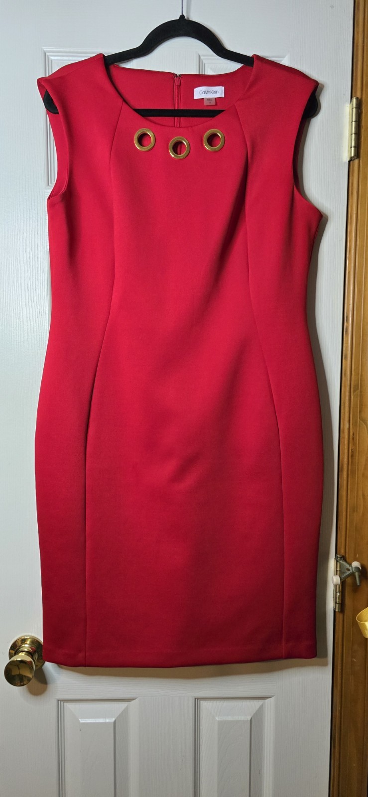This Women's Calvin Klein red sheath dress in size 14 is perfect for business work events or dinner parties. The sleeveless dress features a round neckline with a zip closure, made from a stretchy knit of 91% polyester and 9% spandex. The knee-length dress has a solid red color with grommet accents, making it a stylish and versatile option for various occasions. Designed by Calvin Klein, this sheath dress is a must-have for any designer wardrobe.