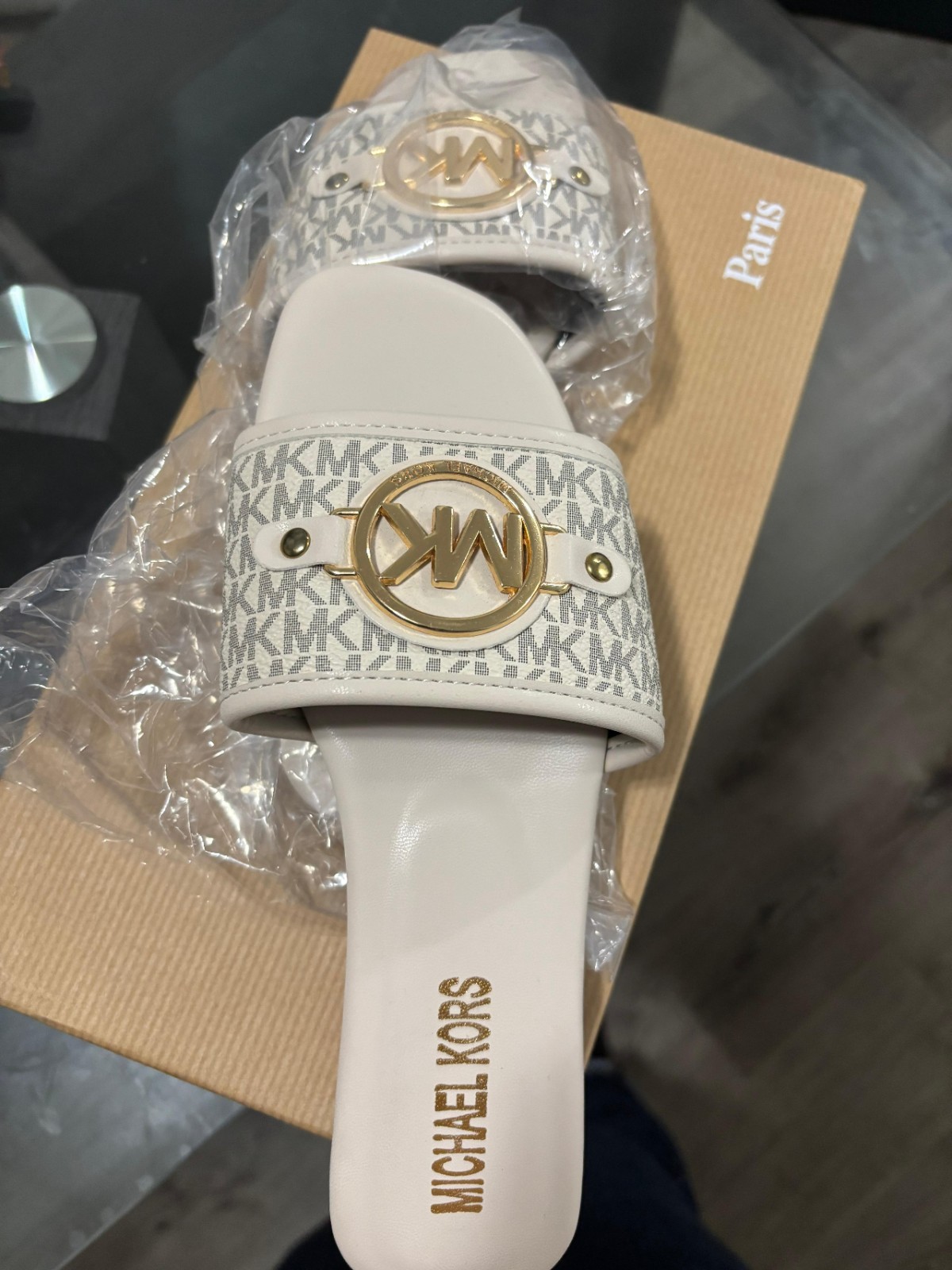 Michael Kors Logo Metal Slip-On Slide Sandals White Gold Women | ThriftGalaxy — ThriftGalaxy