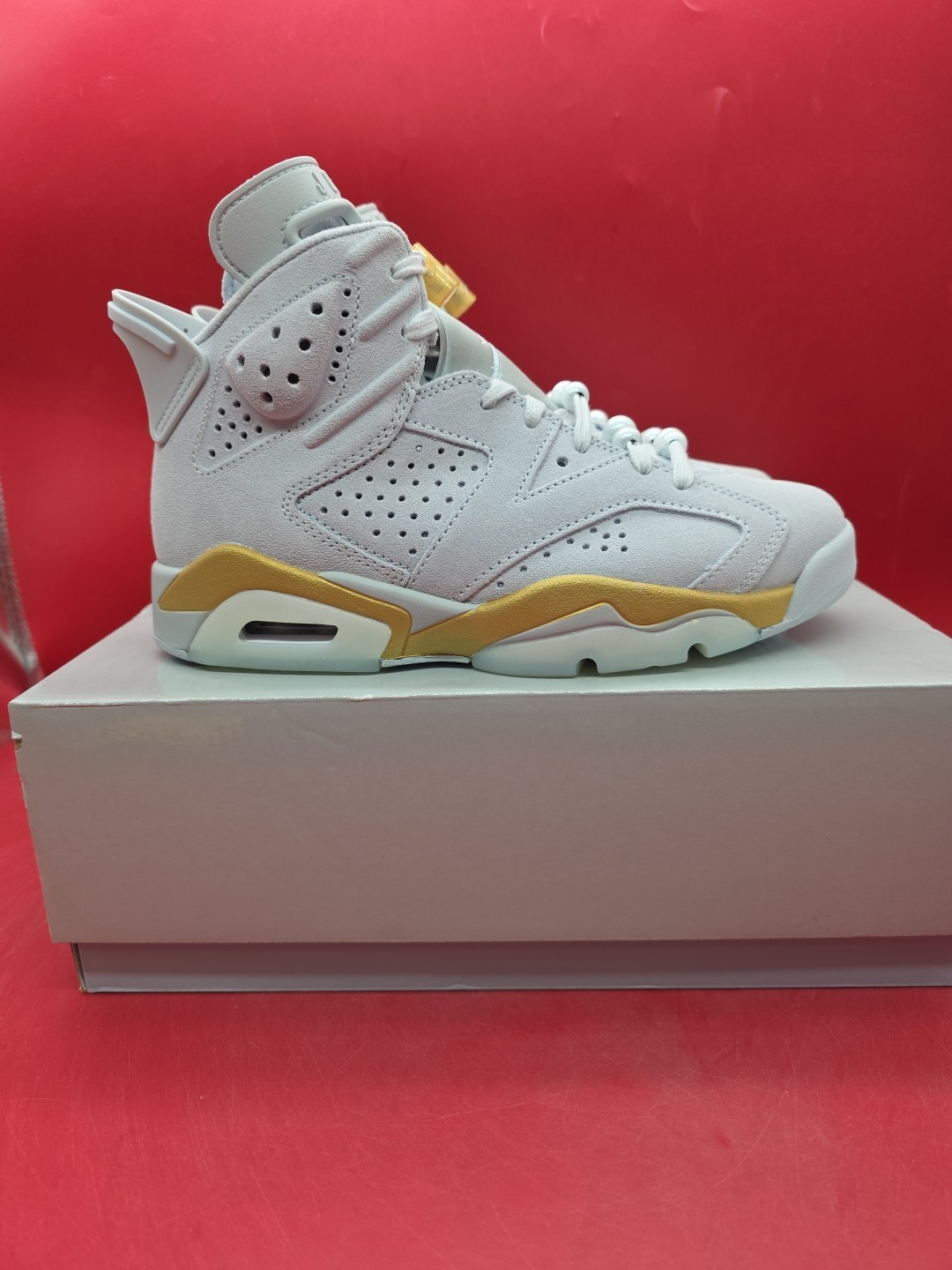 This is a brand new item. The product is a pair of Jordan 6 Retro women's shoes in size 6.5, featuring a grey and gold color scheme with an iced suede design. These lace-up sneakers are part of the Air Jordan product line and have a rubber outsole for durability. With a comfortable and breathable design, these shoes are suitable for various activities such as gym training, walking, and running. The iconic Jordan logo and lace accents add a stylish touch to this classic silhouette, making them a fashionable choice for those who appreciate both comfort and style. 1614