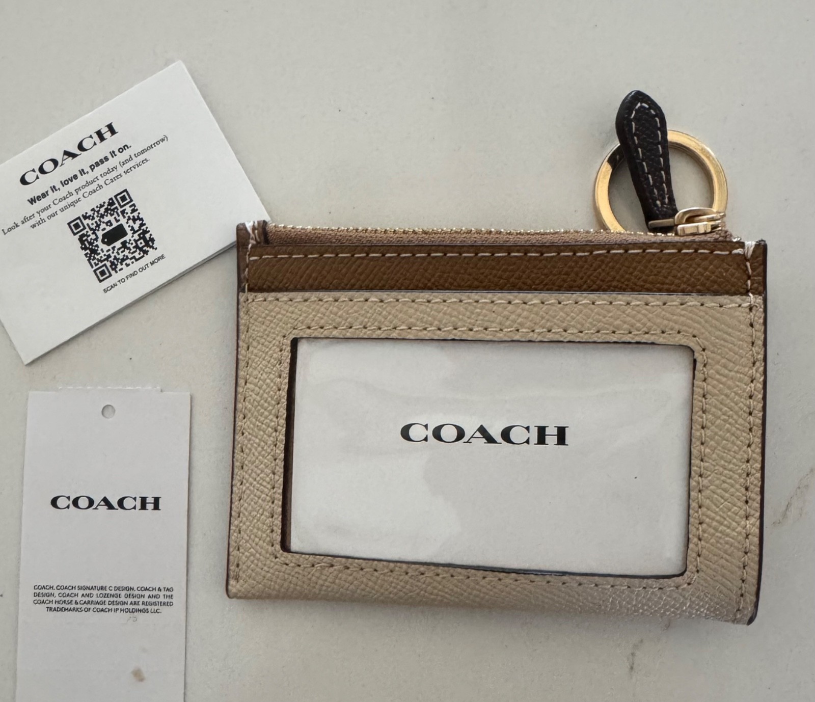 The Coach Mini Skinny ID Card Case in Ivory light saddle is a stylish and practical accessory for women. Made from coated canvas and leather, this card wallet features a solid pattern with a subtle C logo accent. The wristlet design includes a strap, zipper closure, and credit card slots, perfect for keeping your essentials organized in one compact size. The ivory color and retro theme make it a versatile piece that can complement a variety of outfits.