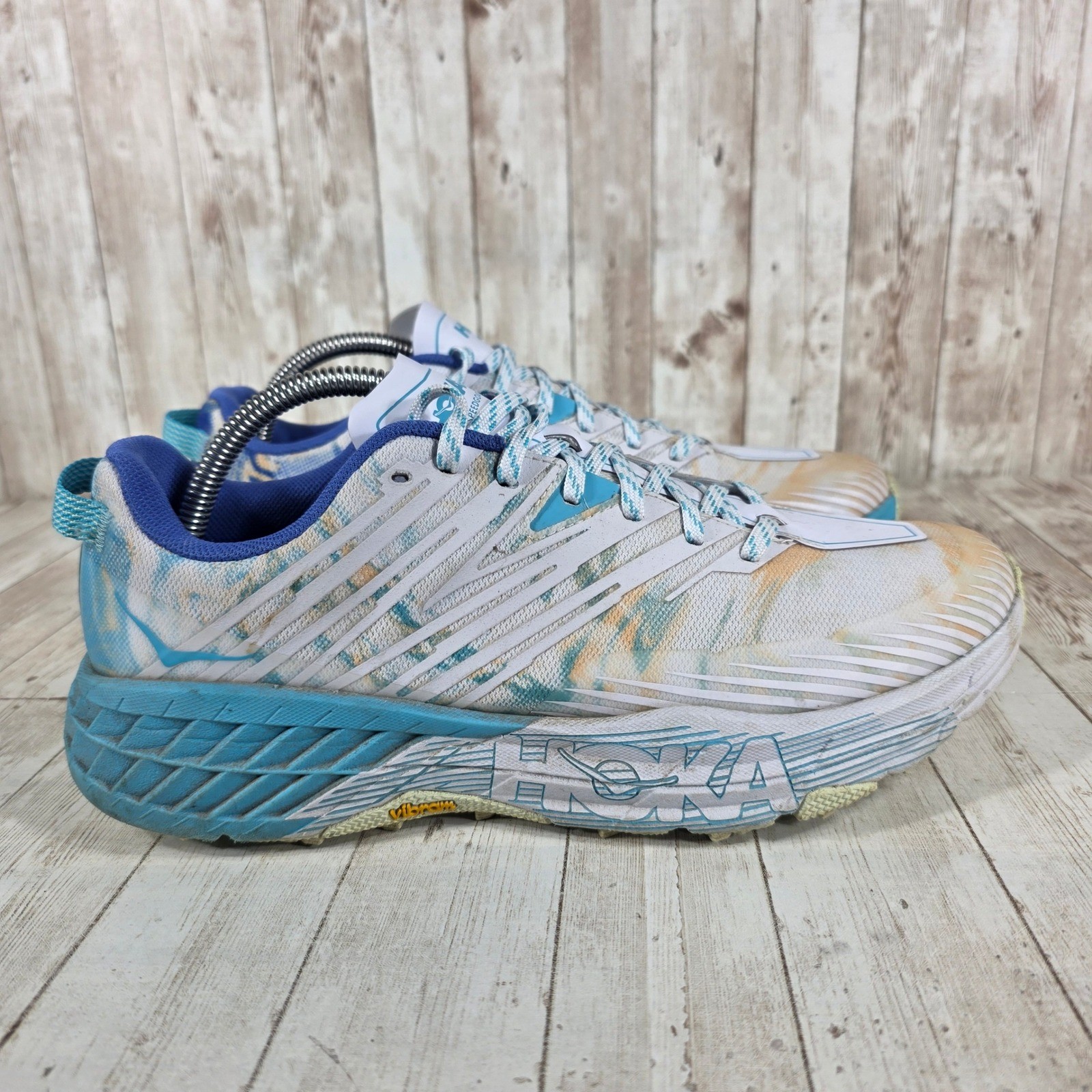 Conquer any trail with these Hoka One One Speedgoat 4 trail running shoes. The vibrant blue tie-dye pattern adds a unique flair to your outdoor adventures, while the lightweight design and cushioned support ensure comfort with every stride.