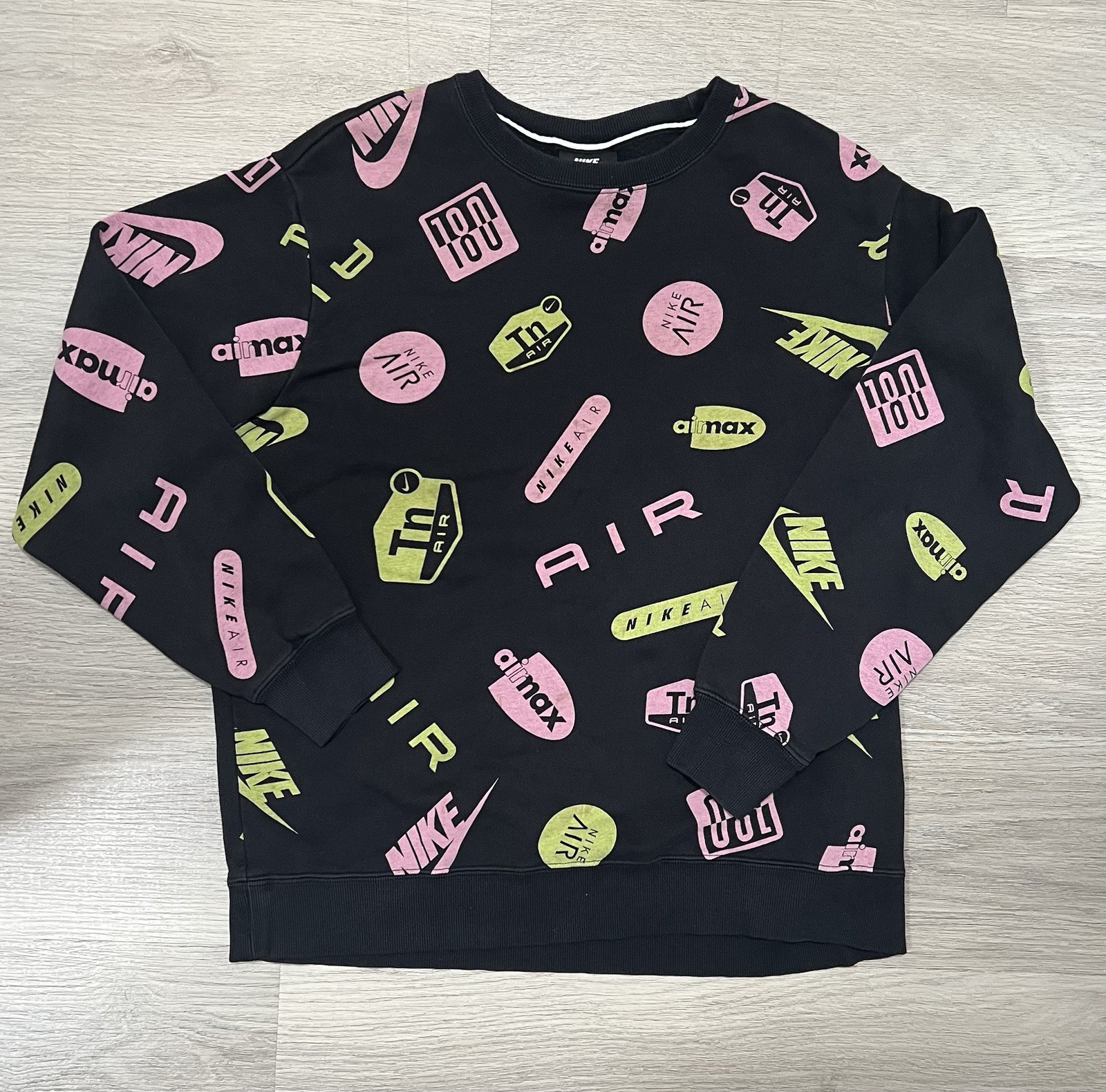 The Nike Air Max Black Graphic Print Fleece Sweatshirt in Men's Size M features a stylish all-over graphic print with the iconic Nike swoosh logo. Made of a comfortable blend of polyester, spandex, and cotton, this pullover sweatshirt has long sleeves and a crew neck neckline. The black design with accents of pink and green makes it a versatile piece for any casual outfit, perfect for sports enthusiasts and fans of the Nike brand.