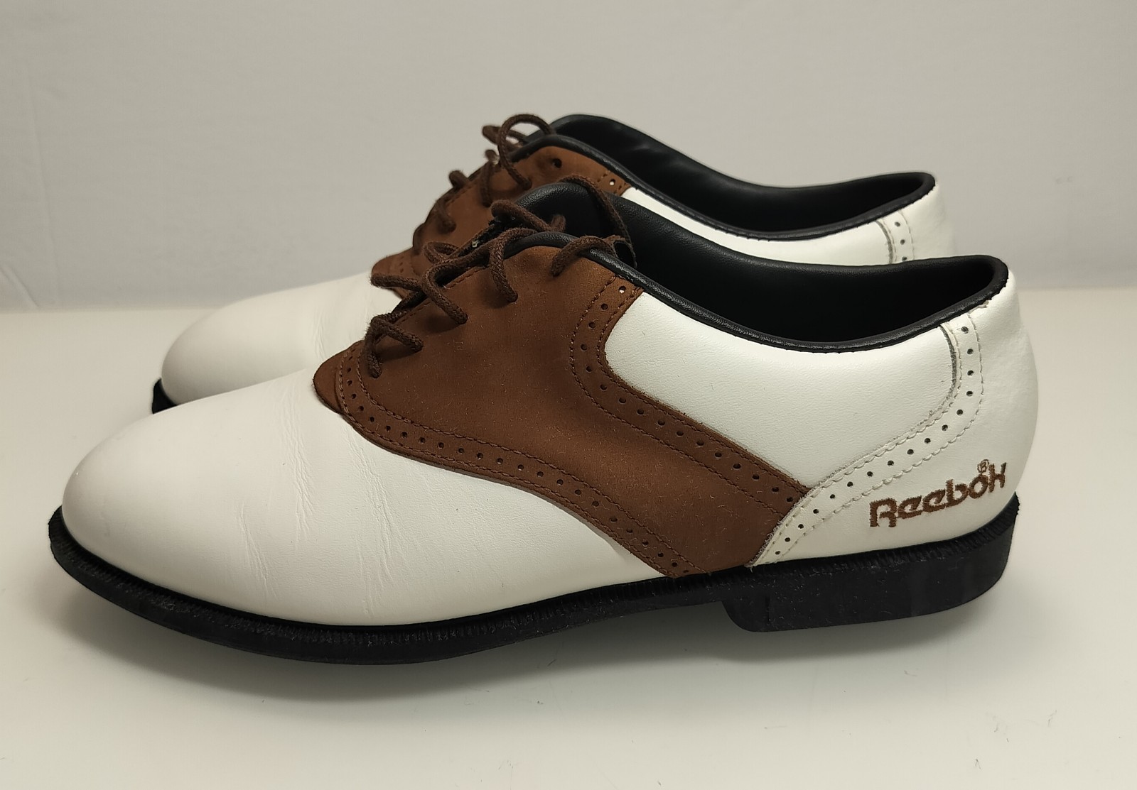 The product is a pair of women's Reebok leather golf shoes in size USA 8, equivalent to UK size 5.5 and EU size 38.5. These lace-up shoes feature a white and brown color scheme with a USA theme, making them stylish and functional for golfing activities. Made with leather upper material and standard width, these shoes are designed for optimal performance in the summer, fall, and spring seasons. Perfect for any female golfer looking for high-quality footwear that combines style and functionality on the course.