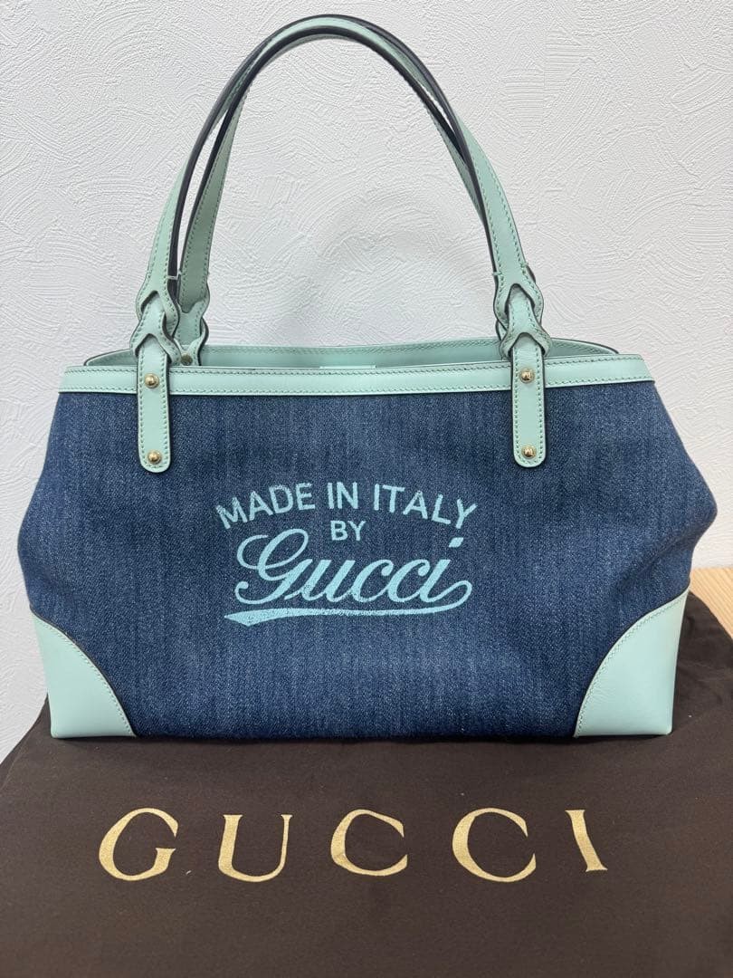 This authentic Gucci denim tote bag is a stylish and versatile accessory, featuring a vibrant mint-colored handle and embroidered logo. - Genuine Gucci product with high-quality denim material. - Authentic Gucci tote bag made from durable denim.