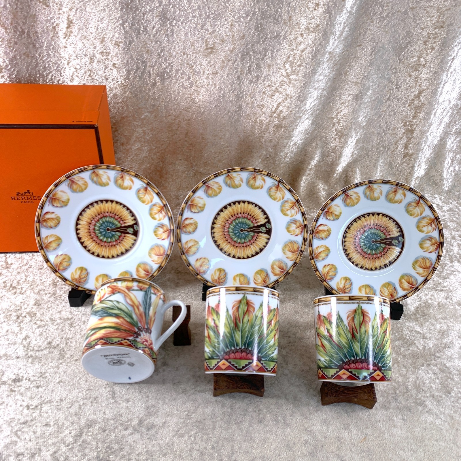 Hermes Paris Demitasse Cup & Saucer Patchwork Brazil Porcelain Tableware 3 Sets