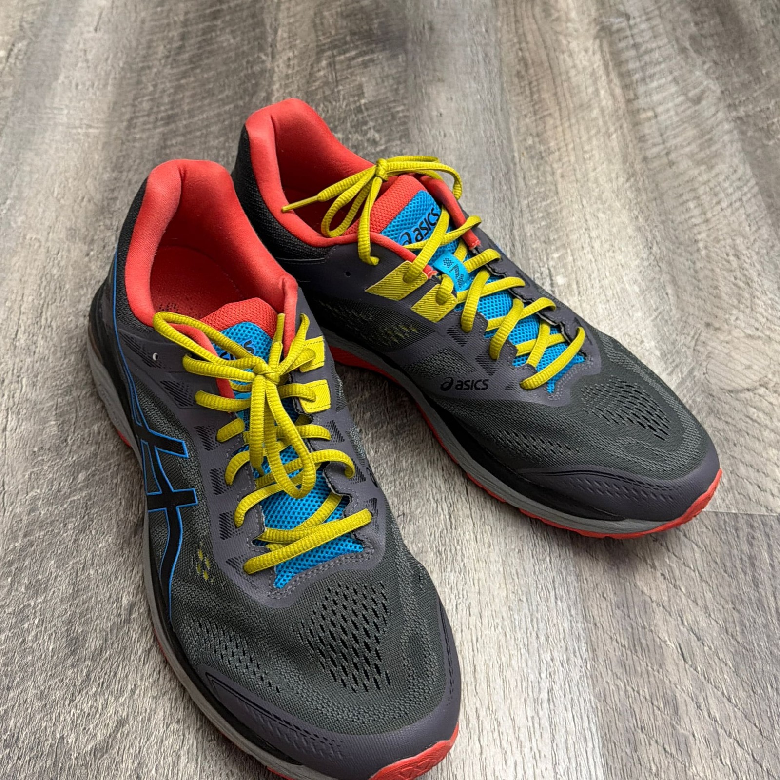 Asics GT-2000 Trail Running Shoes. Features Gel cushioning technology for maximum shock absorption and stability on various terrains. Eye-catching design with a grey mesh upper, vibrant teal and yellow accents, and a red interior lining. These performance sneakers are perfect for trail running, hiking, or everyday athletic wear. Good pre-owned condition with some visible signs of wear as shown in photos. Plenty of tread remaining for your next adventure.