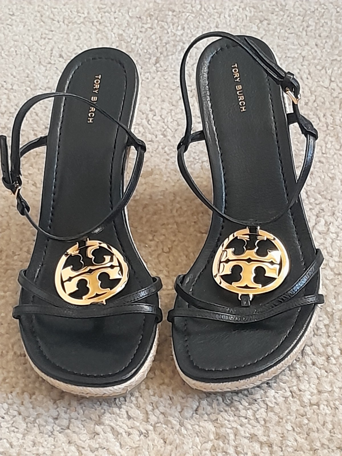 The NEW Tory Burch Capri Miller Espadrilles in black leather shoes in siu.ze 11 are the perfect addition to any woman's wardrobe. These stylish sandals feature a solid black color with leather lining and accents.
