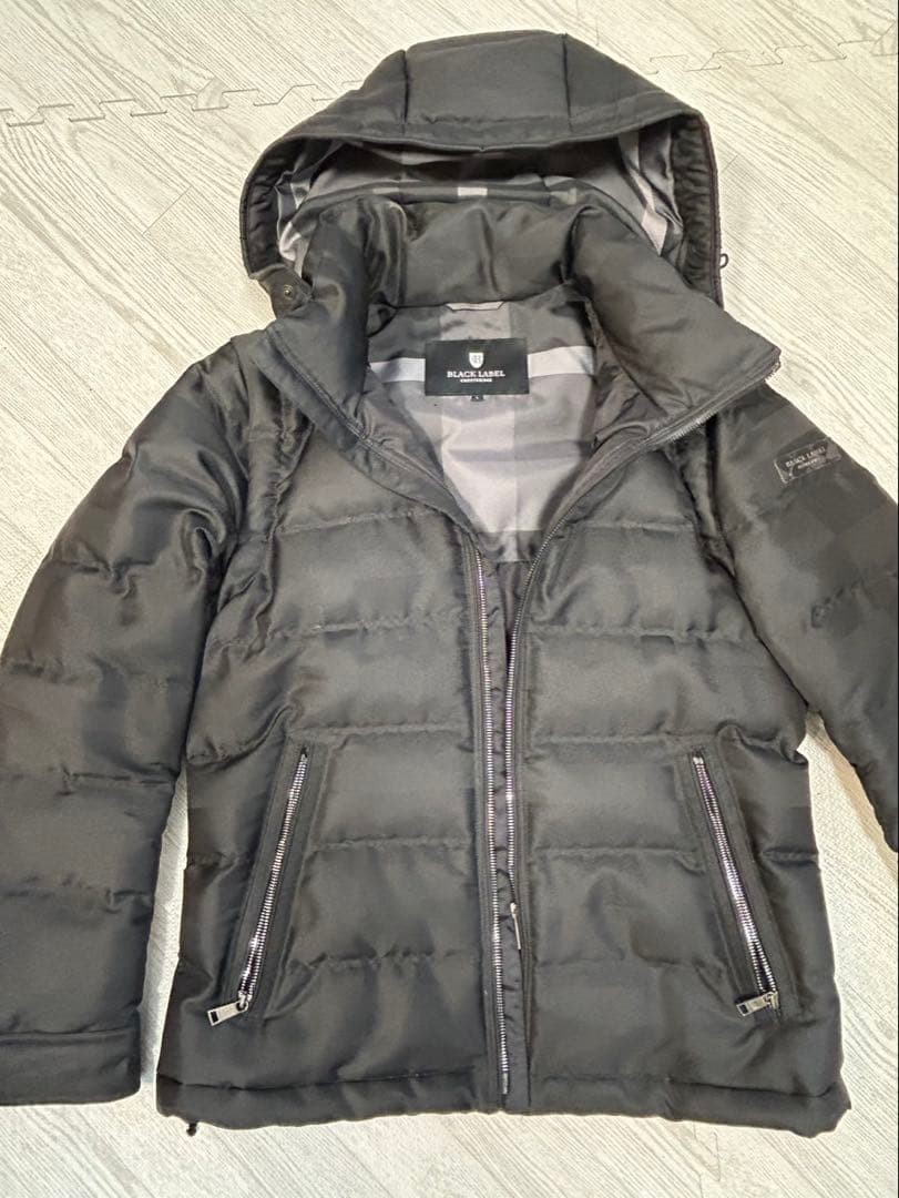 Design: Hooded Down Jacket. Stay warm with this stylish BLACK LABEL black down jacket featuring a hood and a distinctive checkered lining. Perfect for cold weather, this jacket combines functionality with a fashionable design.