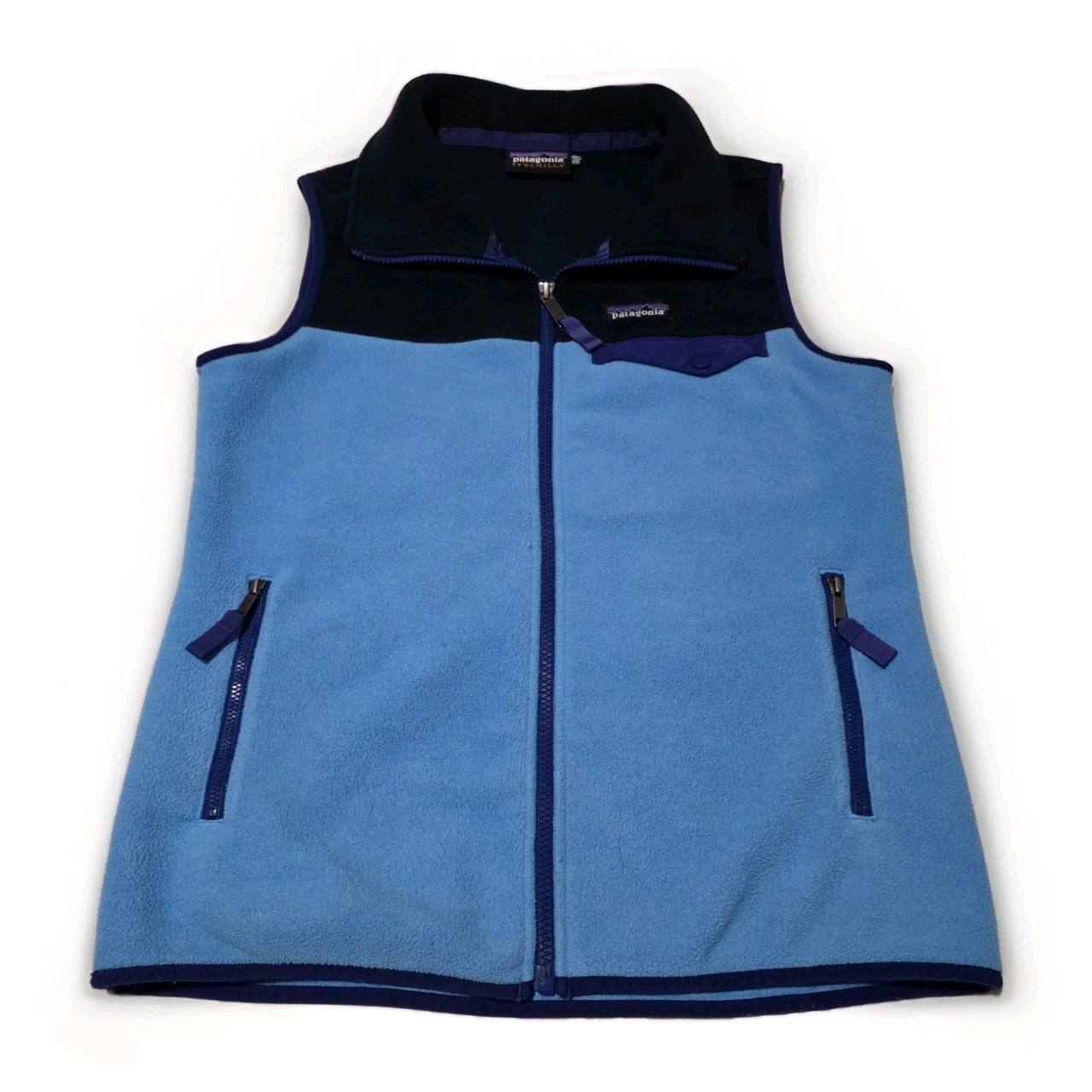 The Patagonia Synchilla Fleece Full Zip Vest in women's size medium is a stylish and functional outerwear piece ideal for travel and casual occasions. Made from polyester fleece, it offers warmth and comfort during the winter, fall, and spring seasons. The vest features a full zip closure, pockets, and a stylish colorblock pattern in blue. With the iconic Patagonia logo accents, this lightweight and machine washable jacket combines practicality with a retro outdoor theme. Blue color block