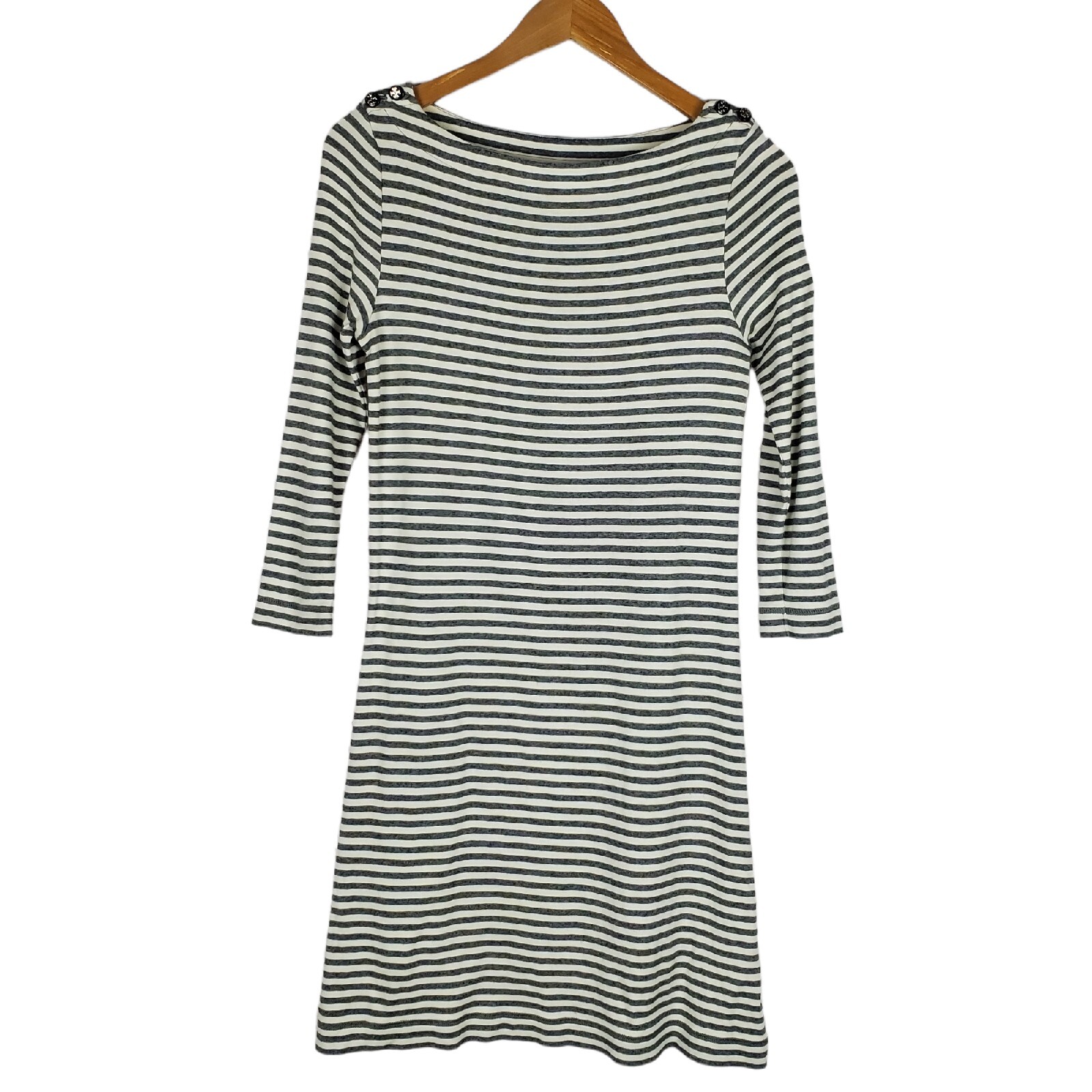 Boatneck with Tory Burch Logo buttons. 100% Pima Cotton. Logo on arm. Gently worn in great condition with minimal to light signs of Wear and no visible flaws noted. No holes or stains. Length 36.5".