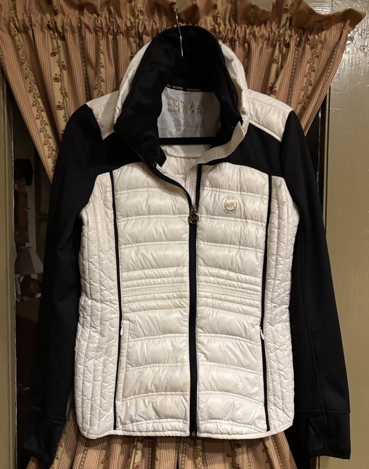 The Michael Kors Zip Up Quilted Jacket in size 6 is a stylish and practical outerwear piece designed for casual occasions. Made from durable nylon with a quilted nylon lining, this long sleeve jacket provides both warmth and fashion-forward style. With a regular fit and size type, it is perfect for the winter and fall seasons. The Michael Kors brand ensures high quality and a touch of luxury, making this jacket a versatile addition to any woman's wardrobe. Easy to care for with machine washable fabric, this jacket is a must-have for those looking for a chic and functional jacket. I wore it once Trying to sell what I don’t wear